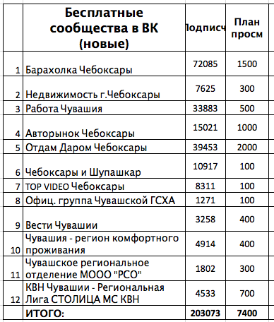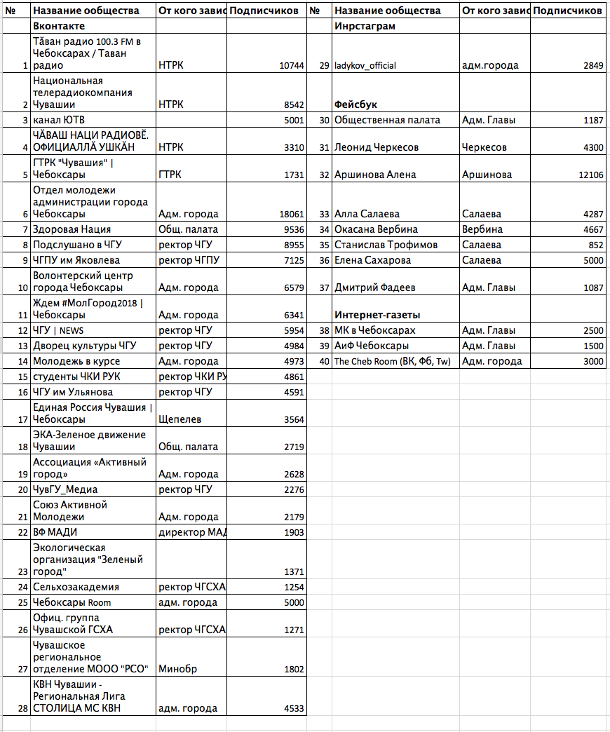 Делать выводы пока рано, но, по всей видимости, мы нашли медиаплан администрации города Чебоксары. Я уже писал про провластные паблики на выборах президента, ну а теперь стало понятно, как это все работает. Есть паблики, которые контролируются государственными органами, а есть независимые, но которые берут на размещение пропагандистские новости. Каждый день специальный сотрудник администрации отчитывается о проделанной работе в таблице со статистикой.