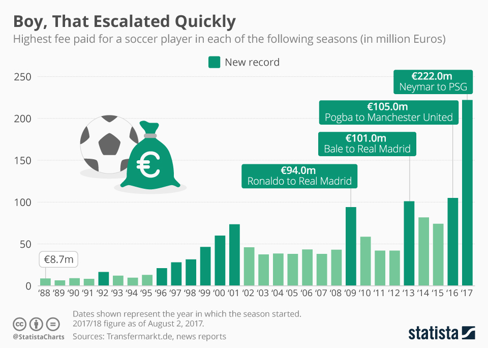 - В результате сделка «Реала» с «Ювентусом» займет всего 7-е место в футбольной истории. Рекорд остается за бразильцем Неймаром — французский «Пари-сен-Жермен» в 2017 году заплатил за него €222 млн. Такую высокую планку задали арабские нефтегазовые деньги: в 2011 французский клуб купил катарский фонд Oryx Qatar Sports Investments, и с тех пор потратил на покупку футболистов более €1 млрд.