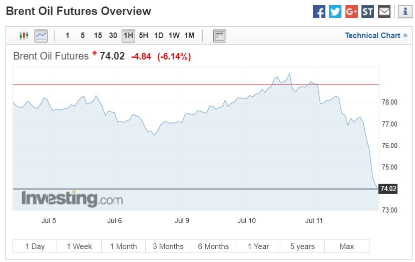 Нефть марки Brent в среду потеряла более 5% своей стоимости, опустившись к 22:00 по московскому времени до $74,02 за баррель.