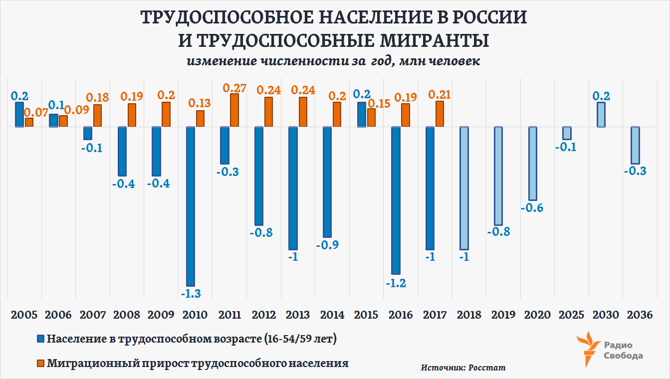 Изменения этой численности за последние 12 лет, а также прогноз Росстата на последующие 18 лет мы сопоставили с динамикой миграционного прироста трудоспособного населения в стране с 2005 года. То есть разницей между количеством приехавших в Россию в течение каждого года мигрантов соответствующего возраста и количеством уехавших за то же время. Например, в 2017 году в страну приехали в целом 4,77 млн человек, уехали - 4,56 млн.