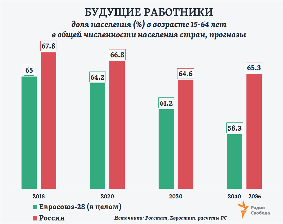 Более того, если сопоставить текущий прогноз по Европейскому союзу на ближайшие десятилетия с расчетами, сделанными по текущему же прогнозу Росстата на период до 2036 года (средний его вариант), то становится очевидным: доля населения в возрасте “15–64 года” в России и впредь будет оставаться заметно большей, чем в странах Европы. Причем разрыв даже увеличится: