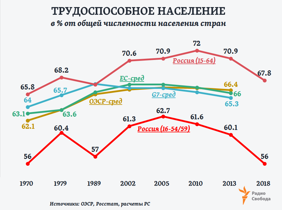 Много это или мало? Провести международные сравнения напрямую не получится. Например, и в Европейском союзе (ЕС), и в 35 странах Организации экономического сотрудничества и развития (ОЭСР) при сравнениях к категории “трудоспособного” относят население в возрасте 15-64 года.