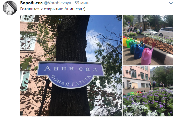 «Имя Анны Политковской украсило карты многих городов мира. Площадь Политковской есть, например, в Риме и во французском городе Монтрей, улица — в Тбилиси и Ферраре. В Карловых Варах парк назван именем Анны Политковской, в Милане — сад. В России пока нет ни улочки, ни переулка, которые увековечили бы имя нашей коллеги. Но теперь будет сад. «Анин сад» — так мы его решили назвать», — рассказали в «Новой газете».