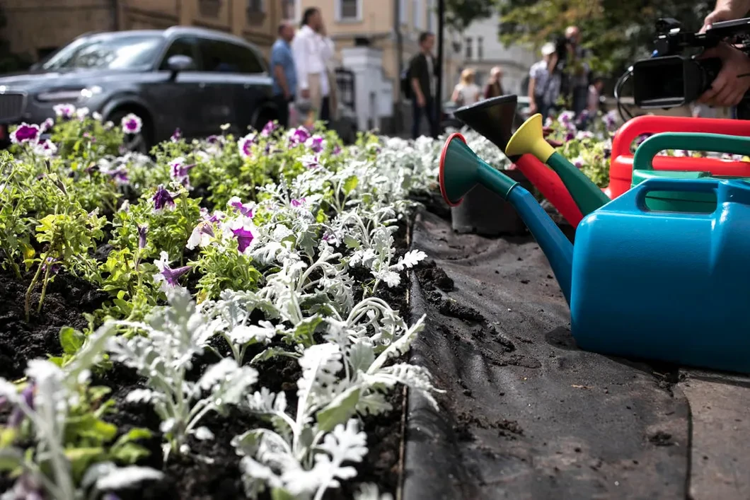 На этом месте, сколько себя помнят на Потаповском переулке, 3 старожилы редакции, был пустырь, заваленный мусором и окурками посетителей ближайших баров. А теперь это красивые клумбы с петуниями, цинерариями, розами, ромашками, а главное, анютиными глазками. Их специально для торжественного дня месяц после окончания сезона хранили для нас в хозяйстве ТД «Цветы Подмосковья» (спасибо директору Сергею Лизунову). Часть цветов приехала из «Аптекарского огорода», еще их несли с собой гости нашего небольшого праздника озеленения, в том числе представители иностранных государств.