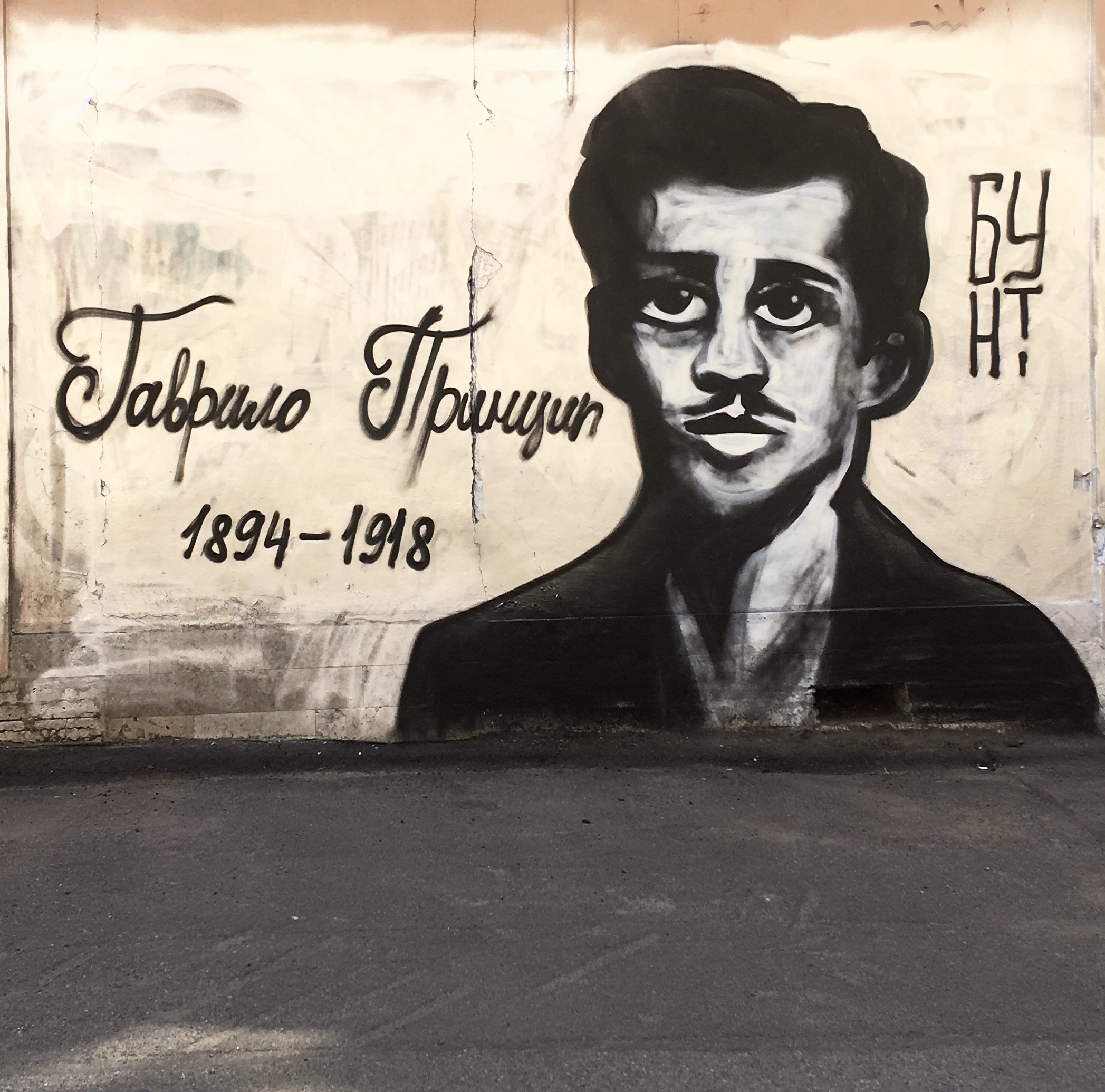 В Банковском переулке нарисовали портрет Гаврилы Принципа — сербского националиста, убившего эрцгерцога Франца Фердинанда. Рядом с рисунком авторы написали «Бунт!».