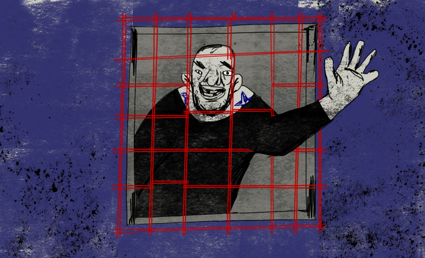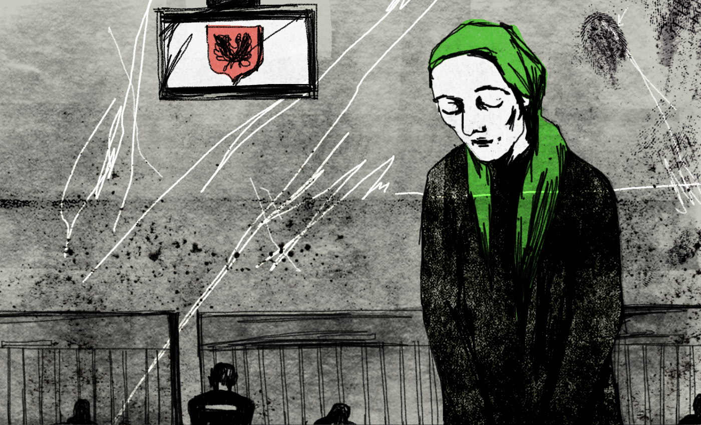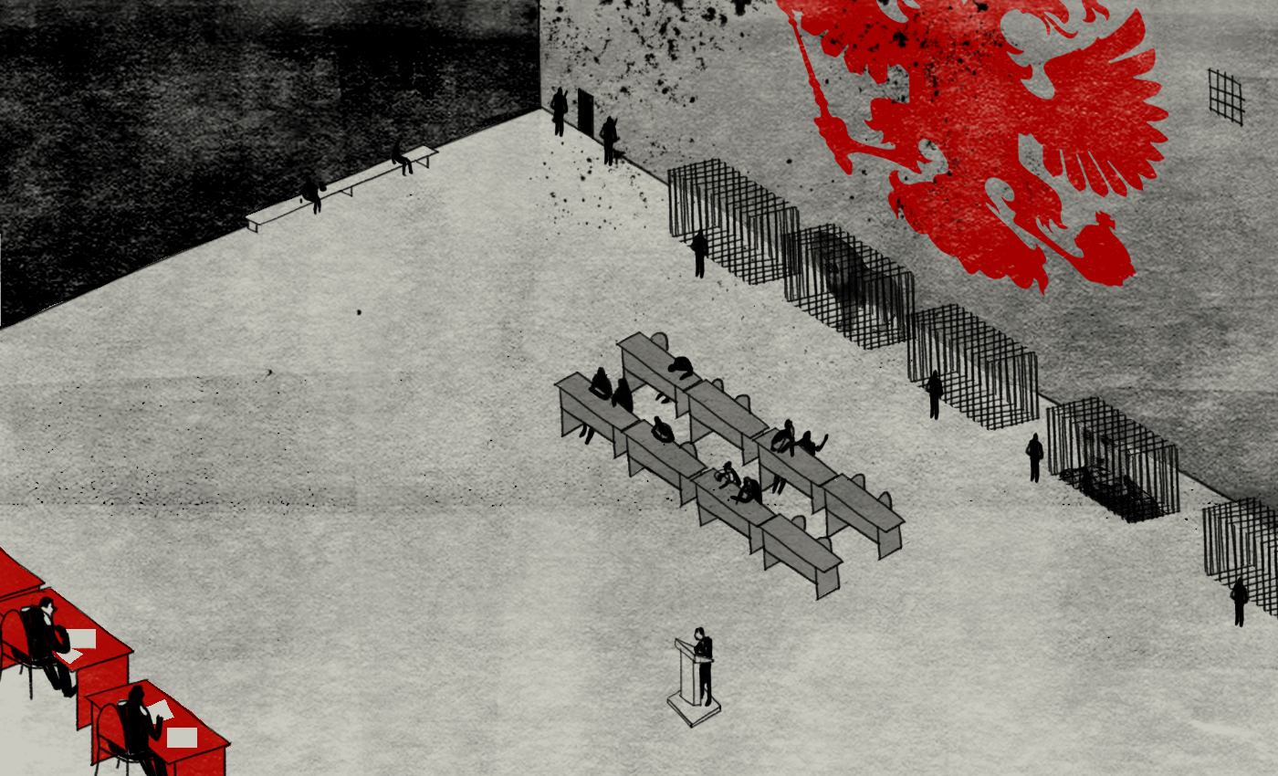 Над высоким забором нависает белая громада СИЗО, из открытых окон которого доносятся крики заключенных. Вдоль забора выстроились автоматчики в зеленой форме и масках, они провожают взглядом входящих в суд — там слушателей обыскивают и забирают у них всю технику, разрешая пронести внутрь только блокнот и диктофон. Зал суда похож на исполинский школьный спортзал, разделенный пополам узорчатым чугунным заборчиком. Заборчик сторожат три автоматчика в масках.