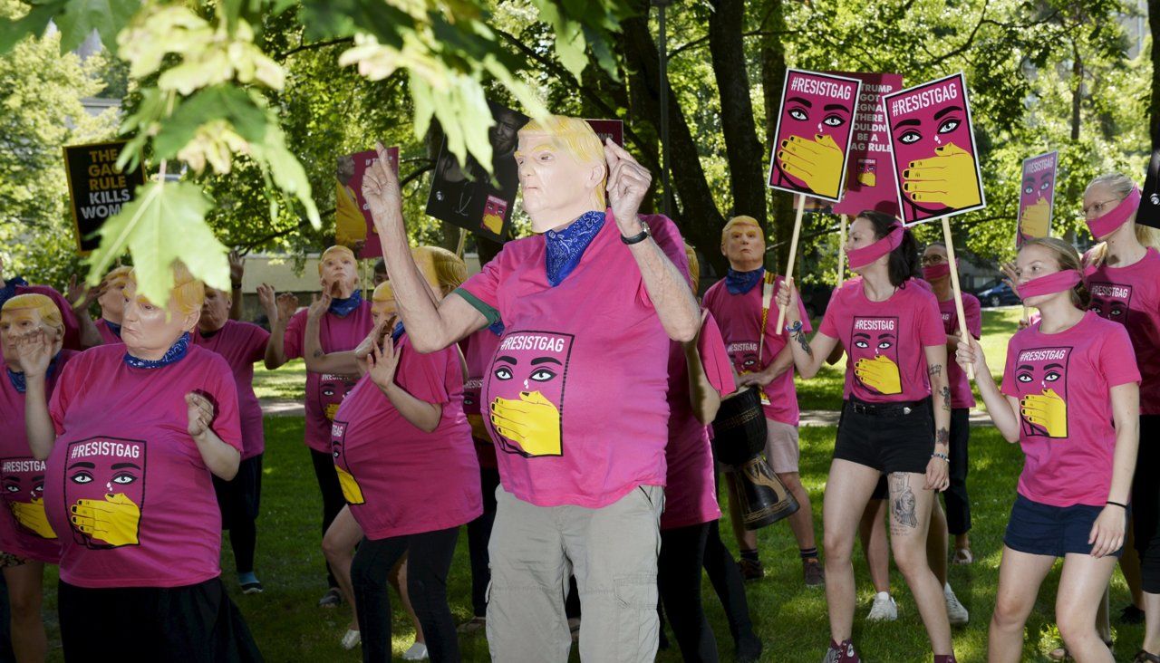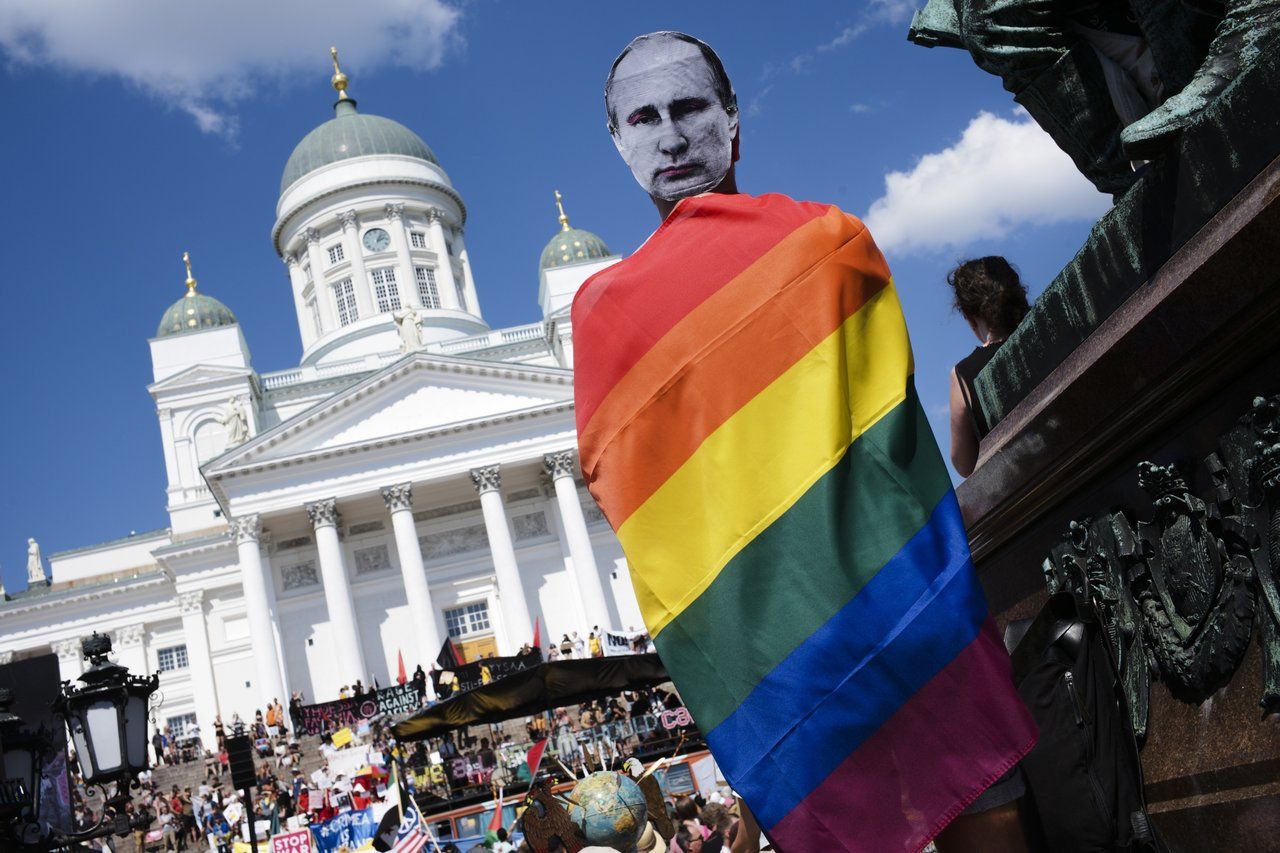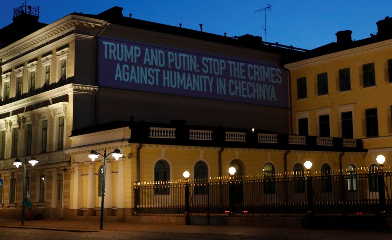 Ahead of the July 16 summit between Vladimir Putin and Donald Trump in Helsinki, mass demonstrations (mostly protests) took place across the city. On July 15, a march in support of human rights attracted roughly 2,500 activists. Projected onto a wall near the presidential palace, a message demanded, “Trump and Putin: stop the crimes against humanity in Chechnya.”