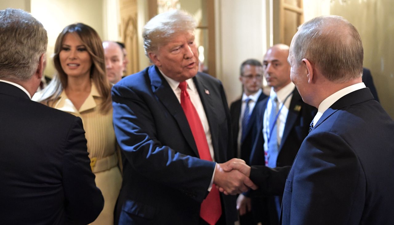 Алексей Никольский / Sputnik / Scanpix / LETA Владимир Путин и Дональд Трамп на встрече в Хельсинки 16 июля 2018 года