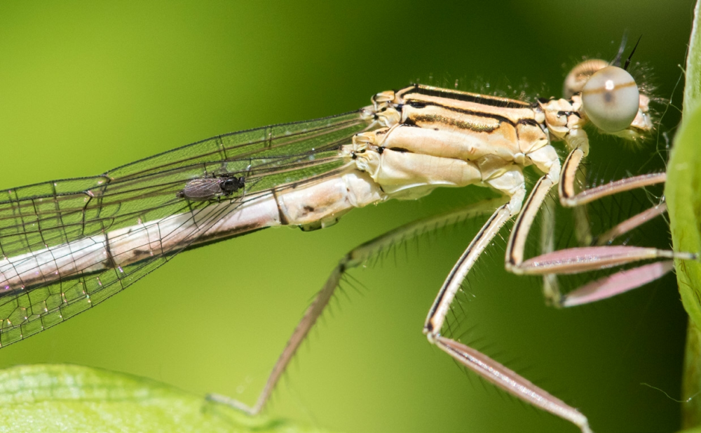 На тропических пляжах охотятся как раз наиболее мелкие Ceratopogonidae рода Culicoides. Я однажды имел несчастье быть атакованным этими мокрецами на Мадагаскаре, где они даже имеют специальное название Mokafohy (мукафý), — ощущения запомнились на всю жизнь, а меня много кусали, поверьте, есть с чем сравнить. В Сети нетрудно найти отчеты французских туристов, которые сбежали с Мадагаскара из-за того, что их зажрали мукафу. В Юго-Восточной Азии род Culicoides представлен видами, отличными от мадагаскарских: укусы их менее болезненны, но ощущения тоже не сладостные. Мокрецы действительно очень малозаметны, это позволило семейству Ceratopogonidae освоить уникальную экологическую нишу — питание кровью (точнее, гемолимфой) других насекомых. На рис. 5 самка рода Forcipomyia кусает стрекозу; мокрецы также нападают на гусениц бабочек, тараканов, жуков.