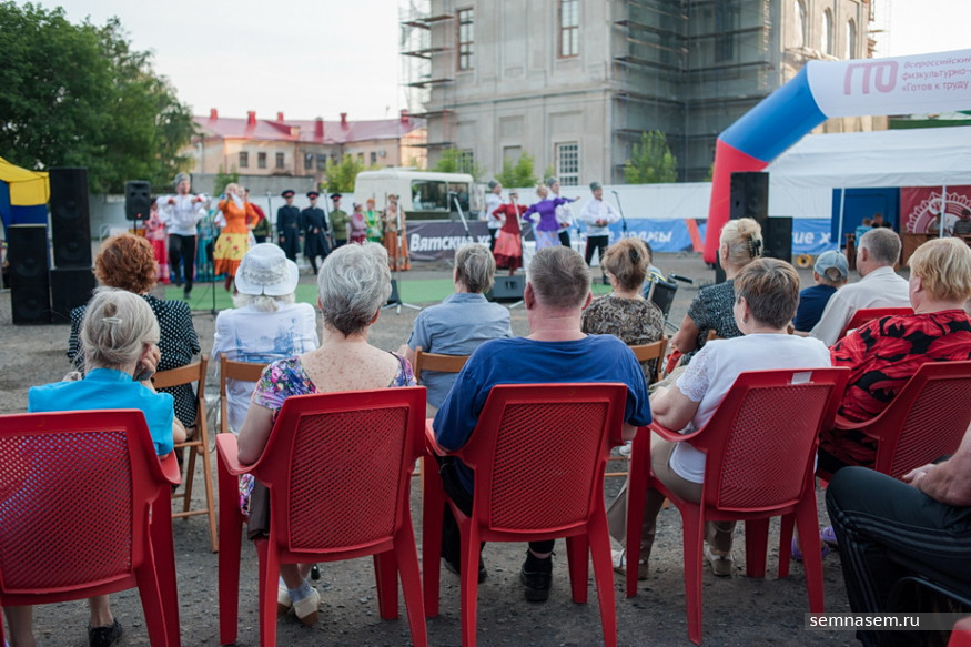 В сквере имени Степана Халтурина было многолюдно — на сцене выступали творческие коллективы, около 300 человек наблюдали за ними. Судя по всему, собравшимся было не скучно — они поддерживали выступающих, особенно громкие аплодисменты звучали после казачьих танцев. В 18:30, когда должен был начаться митинг против пенсионной реформы, заявленный оргкомитетом ПАРНАСа, движениями «Открытая Россия», «Солидарность» и «Союзом грузоперевозчиков „Вятка“», никого, кто бы был похож на протестующих, в сквере не наблюдалось.