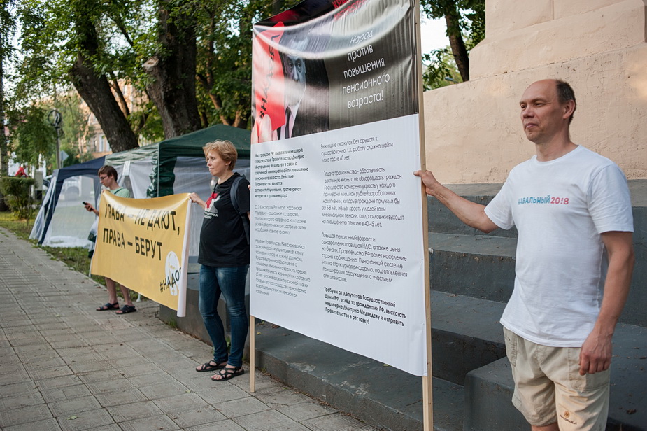 В сквере имени Степана Халтурина 18 июля активисты нескольких организаций пытались провести митинги против повышения пенсионного возраста. Оба мэрия Кирова согласовать отказалась — в гайд-парке в это время проводили акцию для пожилых людей «Активное поколение». Первый митинг закончился почти сразу — полиция потребовала свернуть флаги и плакаты, второй продлился около 20 минут. Как это было — в материале «7x7».