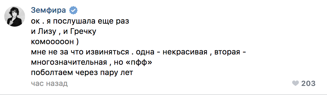 В комментарии явились десятки поклонников Земфиры, Гречки и Монеточки — и начали яростно спорить. Земфира добавила: