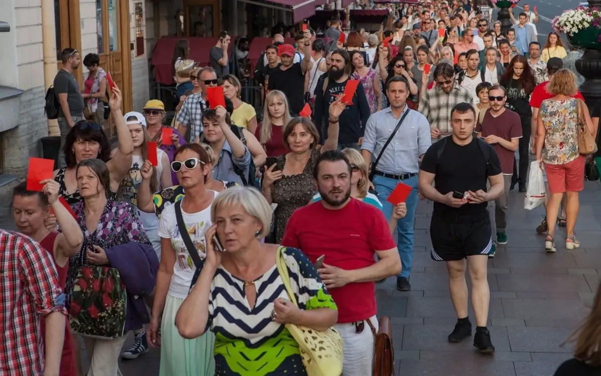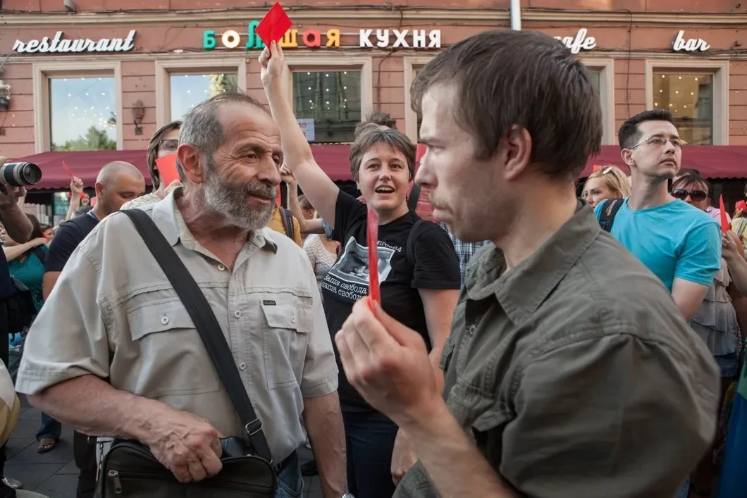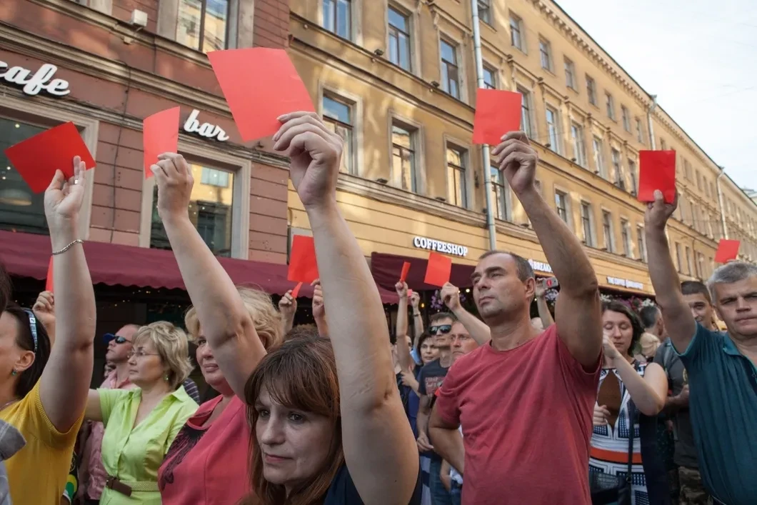 Несколько сотен человек вышли в среду в Петербурге на народный сход на Малой Садовой улице в знак протеста против готовящегося повышения пенсионного возраста. У них не было ни флагов, ни плакатов, ни лозунгов — только красные карточки для чиновников и депутатов, поддержавших повышение пенсионного возраста. Провести согласованные митинги петербуржцам не дали, ссылаясь на президентский указ и «особые меры безопасности» во время чемпионата мира по футболу. Правда, ЧМ уже закончился, а митинги заявлялись именно в тех местах, которые были согласованы с ФСБ для проведения публичных акций во время ЧМ, но это не помешало администрации отказать в согласовании, а суду — признать этот отказ законным.