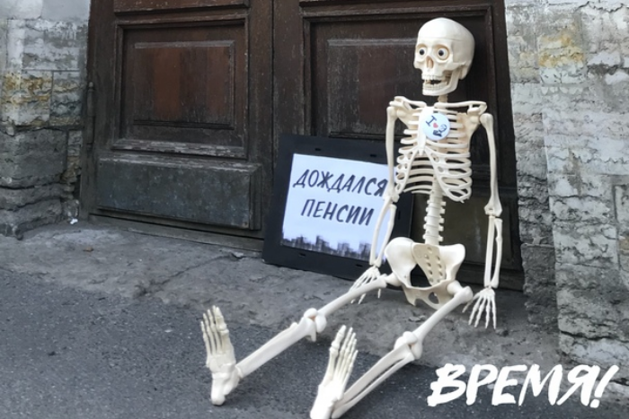Активисты движения «Время» оставили макет человеческого скелета у офиса «Единой России» в Петербурге. Рядом с ним была табличка «Дождался пенсии» и значок «Я люблю Медведева». Акцию приурочили к первому чтению законопроекта о повышении пенсионного возраста в Госдуме, которое проходит 19 июля.