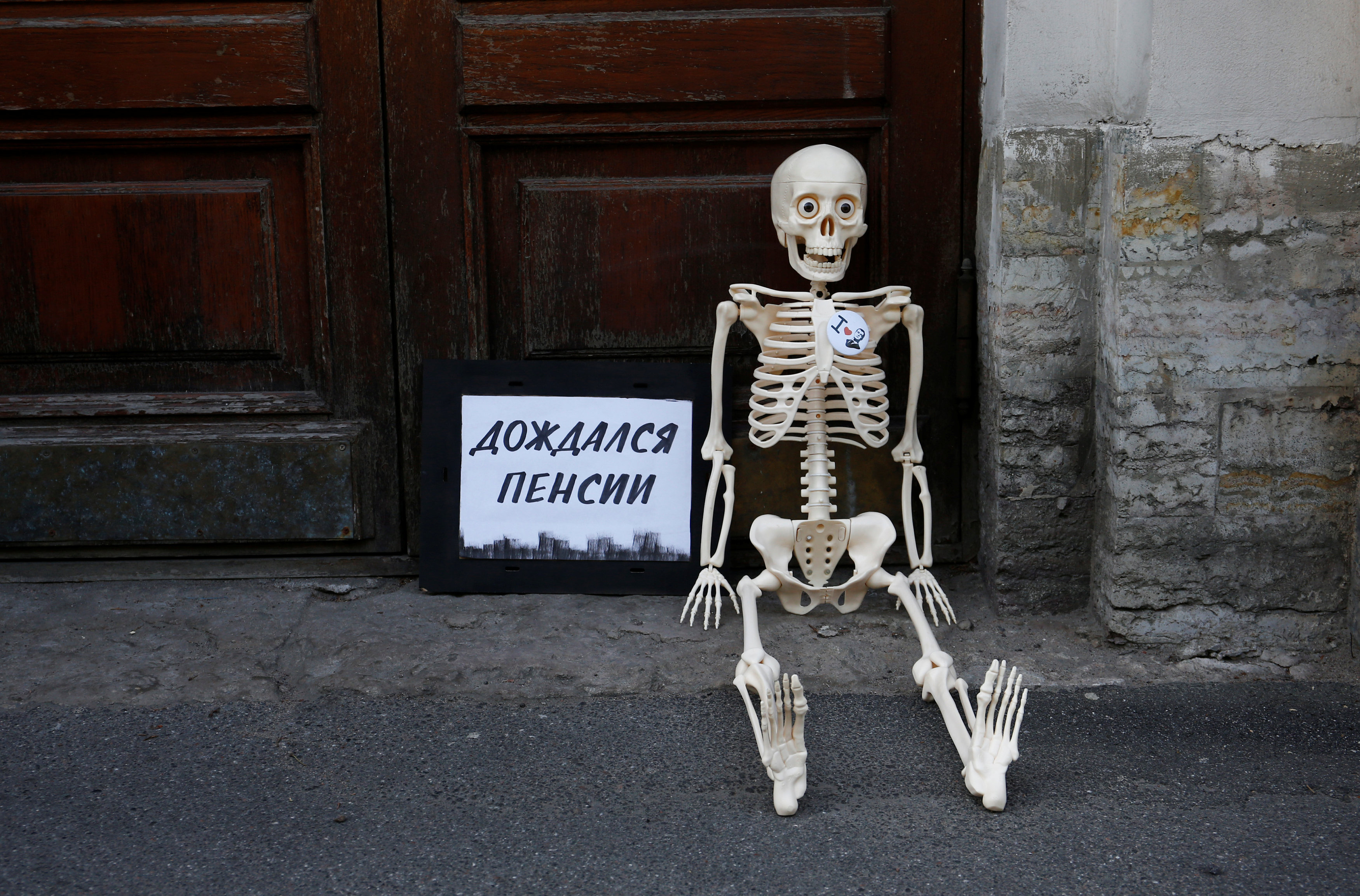 В Санкт-Петербурге движение "Время" провело акцию "Дождался пенсии", усадив на ступеньки приемной "Единой России "скелет с соответствующей табличкой.