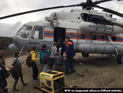Накануне спасатели несколько часов безуспешно пытались пересечь размытую дорогу на тяжелой технике. Однако из-за сильного течения и опасного размыва дна спасательная операция не удалась, и спасатели вызвали вертолет Хабаровского авиационно-спасательного центра МЧС.
