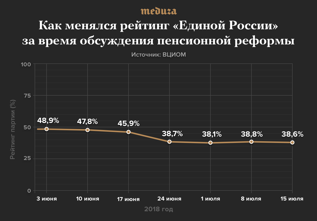 19 июля Госдума в первом чтении приняла законопроект о повышении пенсионного возраста. Это самая громкая и непопулярная инициатива последних лет: по данным «Ромир», она не нравится более 90% россиян; в десятках городов проходят протестные акции. Три из четырех думских фракций — КПРФ, ЛДПР и «Справедливая Россия» — проголосовали против. Но 328 депутатов «Единой России» выступили за, и этого хватило, чтобы законопроект прошел. За время обсуждения проекта рейтинг главной российской партии упал на 10 процентных пунктов. «Медуза» попросила журналиста «Коммерсанта» Андрея Перцева выяснить, как в разных регионах изменились отношения избирателей с депутатами и кандидатами от «Единой России».