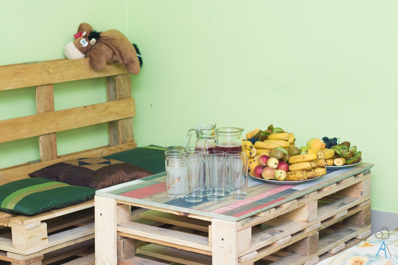 К нам прибегают многие соседи. Есть женщина, которая приходит три раза за день за чашкой кофе — нравится ей у нас [кофе]. Мы не продаем кофе на вынос — у нас нет бумажных стаканов. Если вы со своей кружкой, то можете уйти, а если берете чашку у нас, мы не разрешаем уносить ее с собой. Было необходимо какое-то место, где люди могли бы расслабиться и выпить кофе. Мы использовали как раз паллеты, положили много мягких подушек. Стойка с товарами тоже из паллет. Пока посетителям нравится. Ещё просят, чтобы мы проводили лекции, думаем, как это реализовать.