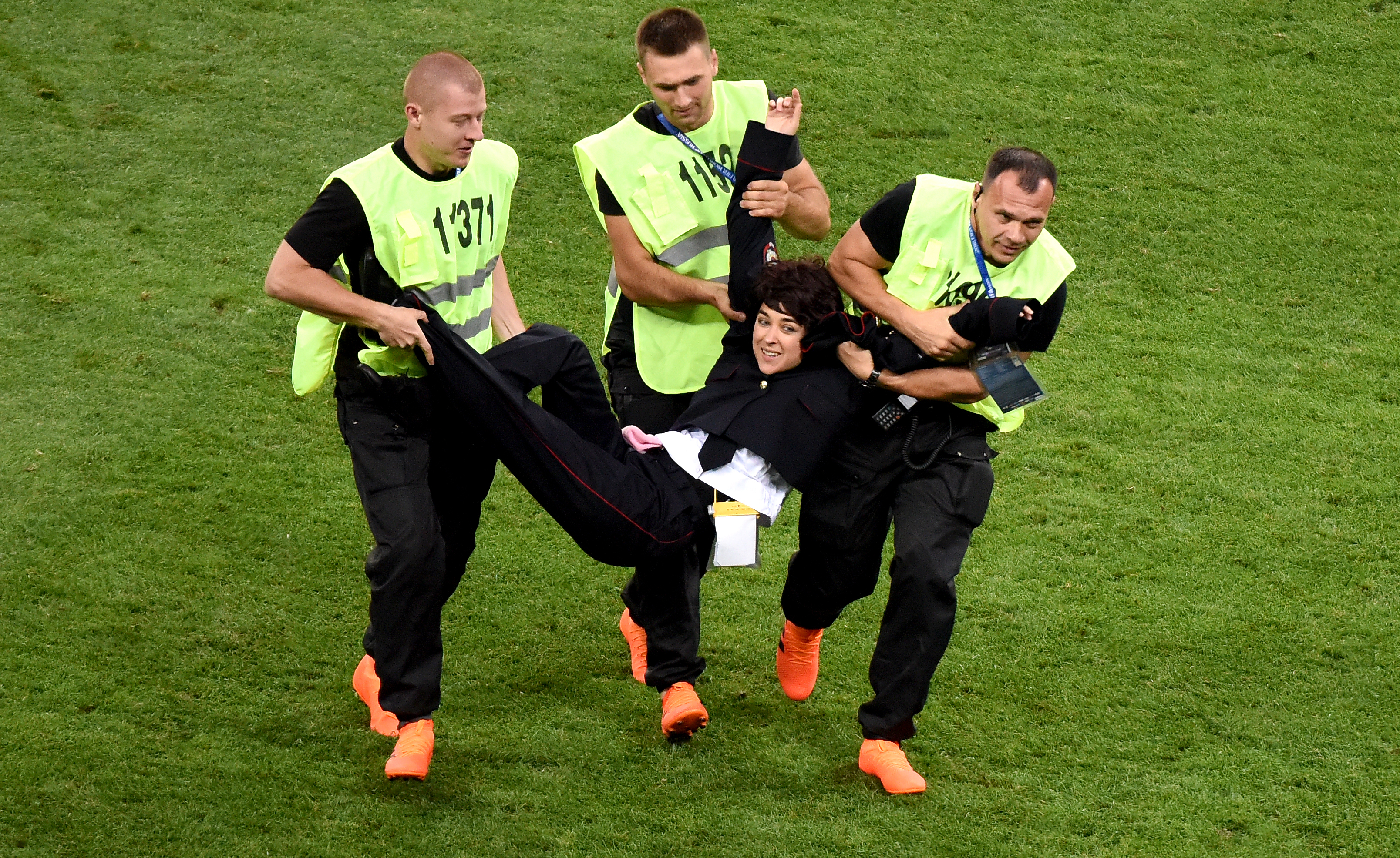 15 июля Pussy Riot, одетые в полицейскую форму, купленную, по их словам, "в магазине", выбежали на поле стадиона "Лужники" в Москве во время финального матча чемпионата мира по футболу. Из-за этого игру пришлось остановить на полторы минуты.