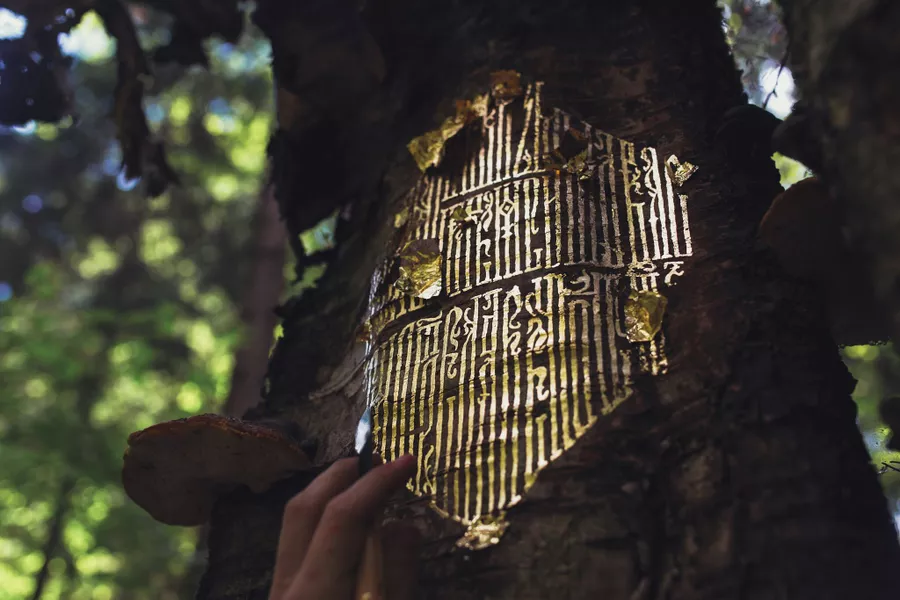 Это проект-популяризатор. Я пишу свою книгу, связанную с нашими буквами. Есть палеографические издания, которые исследуют наше письмо. Они академические, очень классные, но в них мало примеров и информации. Мне как каллиграфу нужно очень много исходного материала — референсы. Поэтому перед тем, как приступить к новому проекту, я составляю таблицу нескольких разных начертаний букв, их комбинирую, и получаю что-то абсолютно новое. Такого материала у меня очень много. Но если этот материал показать обычному человеку как финальный продукт, то ему это будет скучно. Важно подать материал красиво: подача подпитывает интерес, а интерес вовлекает зрителя в твое дело. В итоге зритель становится соучастником, а дальше может превращаться в самостоятельного творца. Что касается леса, я подумал, почему бы наши буквы не поставить в естественное окружение, в природу? Ведь так их можно переплести с жизнью — буквы заговорят. Я живу в Красногорске — выходишь из квартиры и сразу лес. Я обычно хожу туда, чтобы отдохнуть. И как-то во время прогулки у меня в кармане оказался карандаш. Вижу: валяется ствол дерева, и я попробовал на нем сделать буквы. Получилось необычно. Я подумал, почему бы не позолотить это.