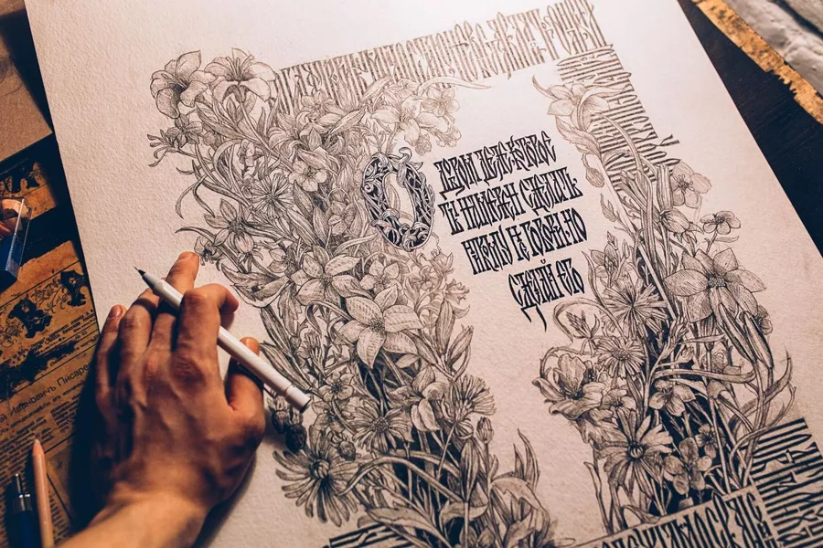 Я всю жизнь рисую. Сложилось так, что на филологическом факультете у нас были уроки палеографии , и несколько занятий были посвящены письму. Меня это заинтересовало. Мы изучали церковнославянский язык, но церковнославянское письмо мы писали ручкой, а его желательно писать пером. Я начал практиковаться и увлекся. Я очень люблю все западные письмена, но после армии я переключился на наши буквы. Почему-то я их полюбил и решил, что ими и буду заниматься. Старорусское письмо — это настолько узкая ниша, что я, когда начинал, думал, что с этим делать, кто это вообще будет заказывать? С Церковью я не всегда работаю, а вне Церкви… в общем, было много вопросов.