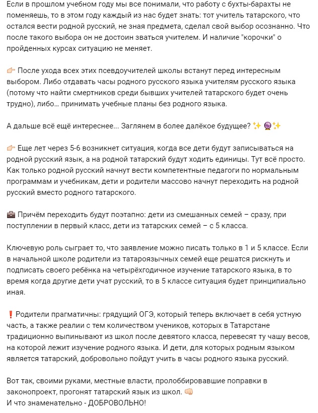 "Как только родной русский начнут вести компетентные педагоги по нормальным программам и учебникам, дети и родители массово начнут переходить на родной русский вместо родного татарского. Причём переходить будут поэтапно: дети из смешанных семей — сразу, при поступлении в первый класс, дети из татарских семей — с 5 класса. Ключевую роль сыграет то, что заявление можно писать только в 1 и 5 классе. Если в начальной школе родители из татароязычных семей еще решатся рискнуть и подписать своего ребёнка на четырёхгодичное изучение татарского языка, в то время когда другие дети учат русский, то в 5 классе ситуация будет принципиально иная. Родители прагматичны: грядущий ОГЭ, который теперь включает в себя устную часть, а также реалии с тем количеством учеников, которых в Татарстане традиционно выпинывают из школ после девятого класса, перевесят ту чашу весов, на которой лежит изучение родного языка. И дети, для которых родным языком является татарский, добровольно пойдут учить в часы родного языка русский", — вот такой прогноз делают в "Родительском сообществе Татарстана".