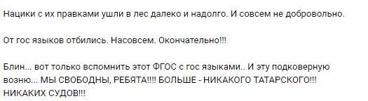 "Федеральные государственные образовательные стандарты дошкольного, начального общего и основного общего образования обеспечивают возможность получения образования на родных языках из числа языков народов Российской Федерации, изучения государственных языков республик Российской Федерации, родных языков из числа языков народов Российской Федерации, в том числе русского языка как родного языка. ...МЫ СВОБОДНЫ, РЕБЯТА!!!! БОЛЬШЕ — НИКАКОГО ТАТАРСКОГО!!! НИКАКИХ СУДОВ!!!"