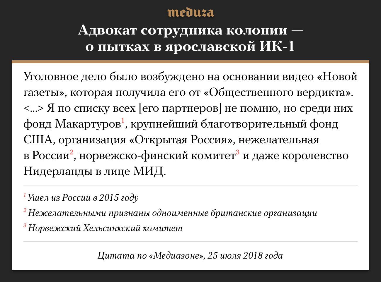Новости о влиянии Запада. Адвокат сотрудника ИК-1, обвиняемого в пытках заключенного, на суде зачем-то вспомнил о том, что фонд «Общественный вердикт», получивший видео с пытками, сотрудничает с целым рядом западных организаций. Тот момент, когда влиянию Запада действительно хочется сказать спасибо.