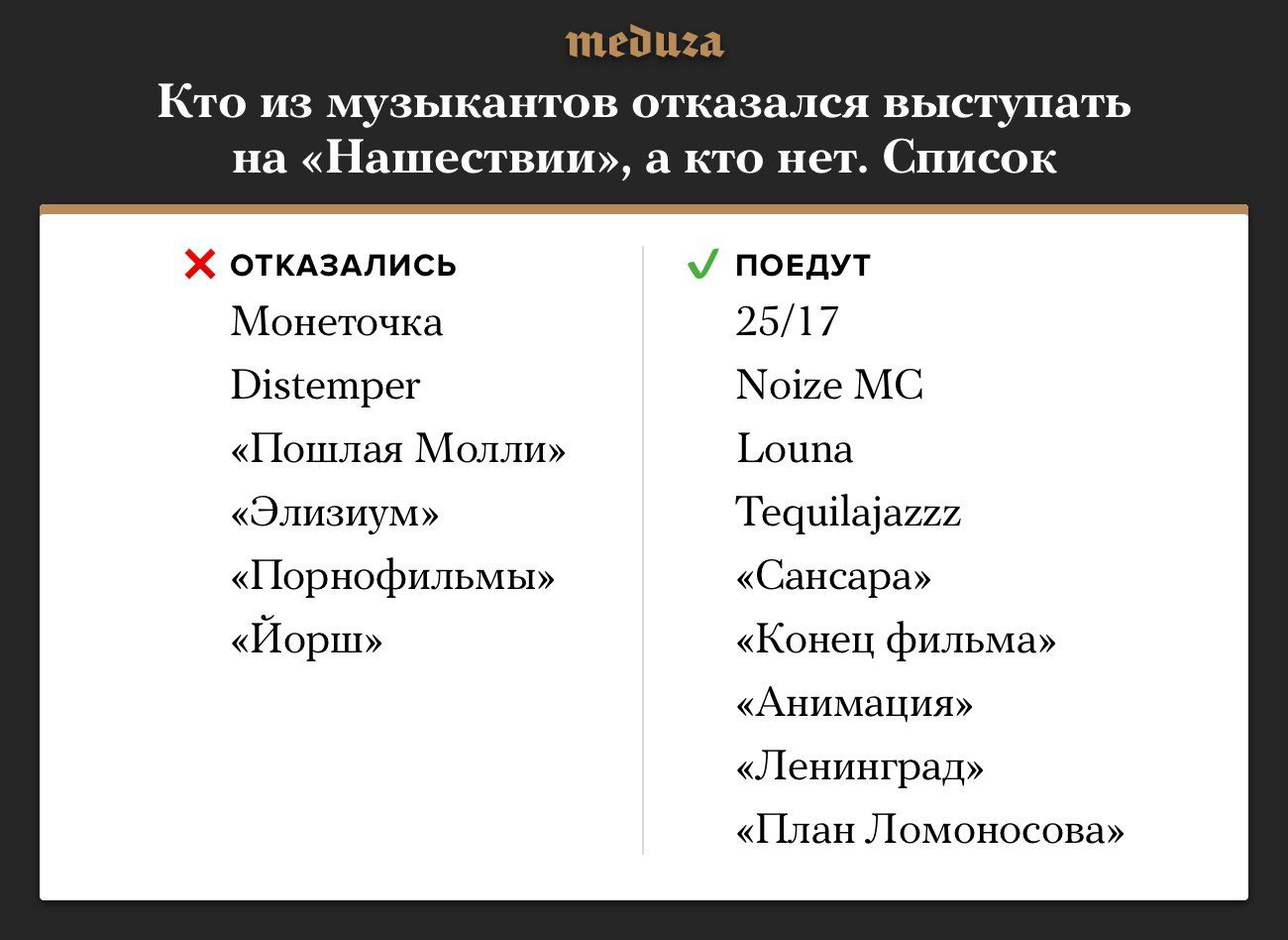 Новости о Монеточке (еженедельные). Певица вслед за «Пошлой Молли» и «Порнофильмами» заявила, что не будет участвовать в «Нашествии» в этом году. Массовые отказы начались после того, как организаторы объявили, что продолжат сотрудничество с Минобороны РФ, — а рок, в общем-то, по сути своей противоположен военной пропаганде. Ну а в интернетах над этим уже вовсю шутят.