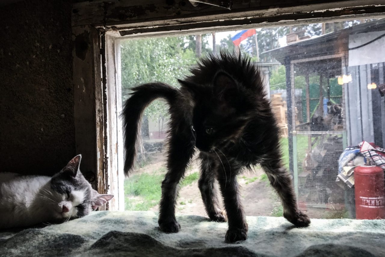 Кошачье царствоФото: Павел Волков для ТД В отдельной бытовке, где Лена готовит еду и хранит вещи, живут еще несколько новых котиков. Хотя новых животных Лена старается не брать. С этими бы справиться. Но иногда невозможно пройти мимо. Месяц назад ее остановил охранник на проходной больницы: «Забери кошку, приблудилась». Елена отказалась, ответила, что на территорию часто забредают деревенские кошки, пусть идет обратно. Через пару дней охранник окликнул снова: «Забери, сдохнет же, доширак она есть не хочет». Лена вошла в вагончик охранника и в углу увидела крошечный, весь в мазуте, дрожащий комок размером с ладошку. Черный с рыжими подпалинами котенок на плече у Лены мурчит и слушает про себя. Лена несколько недель его лечила, отмывала от мазута, а теперь ищет ему дом.