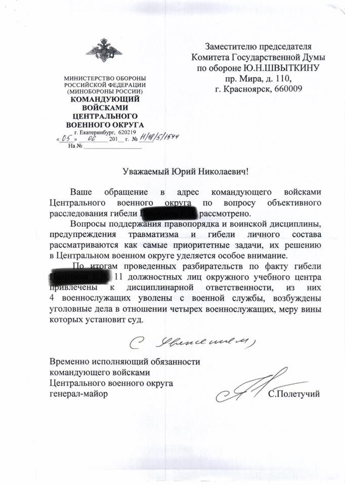 – Я хочу прояснить трагическую гибель военнослужащего из Большой Мурты, – прокомментировал ситуацию Юрий Швыткин. – Его родители требуют объективного расследования. Мною были сделаны депутатские запросы. Командующим войсками Центрального военного округа были проведены разбирательства, в результате 11 должностных лиц окружного учебного центра привлечены к дисциплинарной ответственности, четверо из которых были уволены со службы, возбуждены уголовные дела в отношении четырех военнослужащих, вину которых будет определять суд. Ход и результаты расследования взяты на контроль в военной прокуратуре Центрального военного округа. Я продолжаю держать ситуацию на личном контроле.