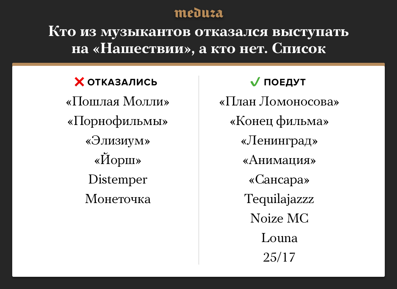 — На «Медузе» выходил материал с реакциями обычных людей. Некоторые писали у себя в соцсетях, что не поедут на «Нашествие», потому что там танки, а они против войны.