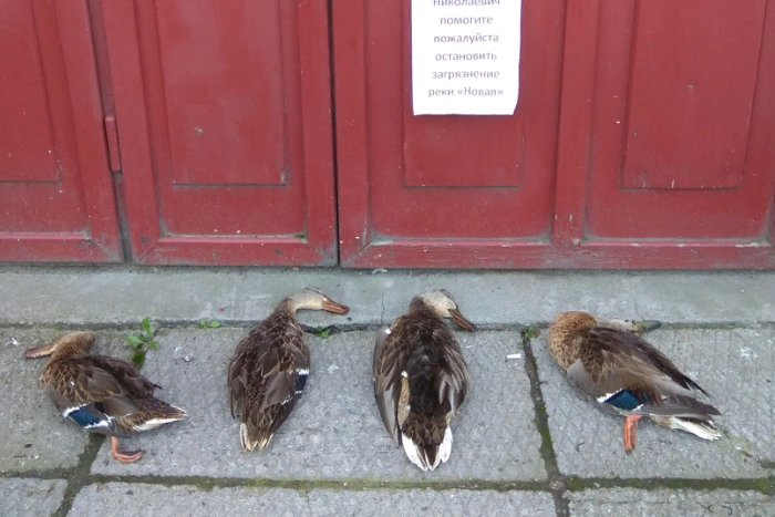 Перед входом в приемную депутата Закса Сергея Никешина на проспекте Ветеранов, 78 положили тела четырех мертвых уток. На двери авторы акции повесили записку с просьбой помочь остановить загрязнение реки Новой.