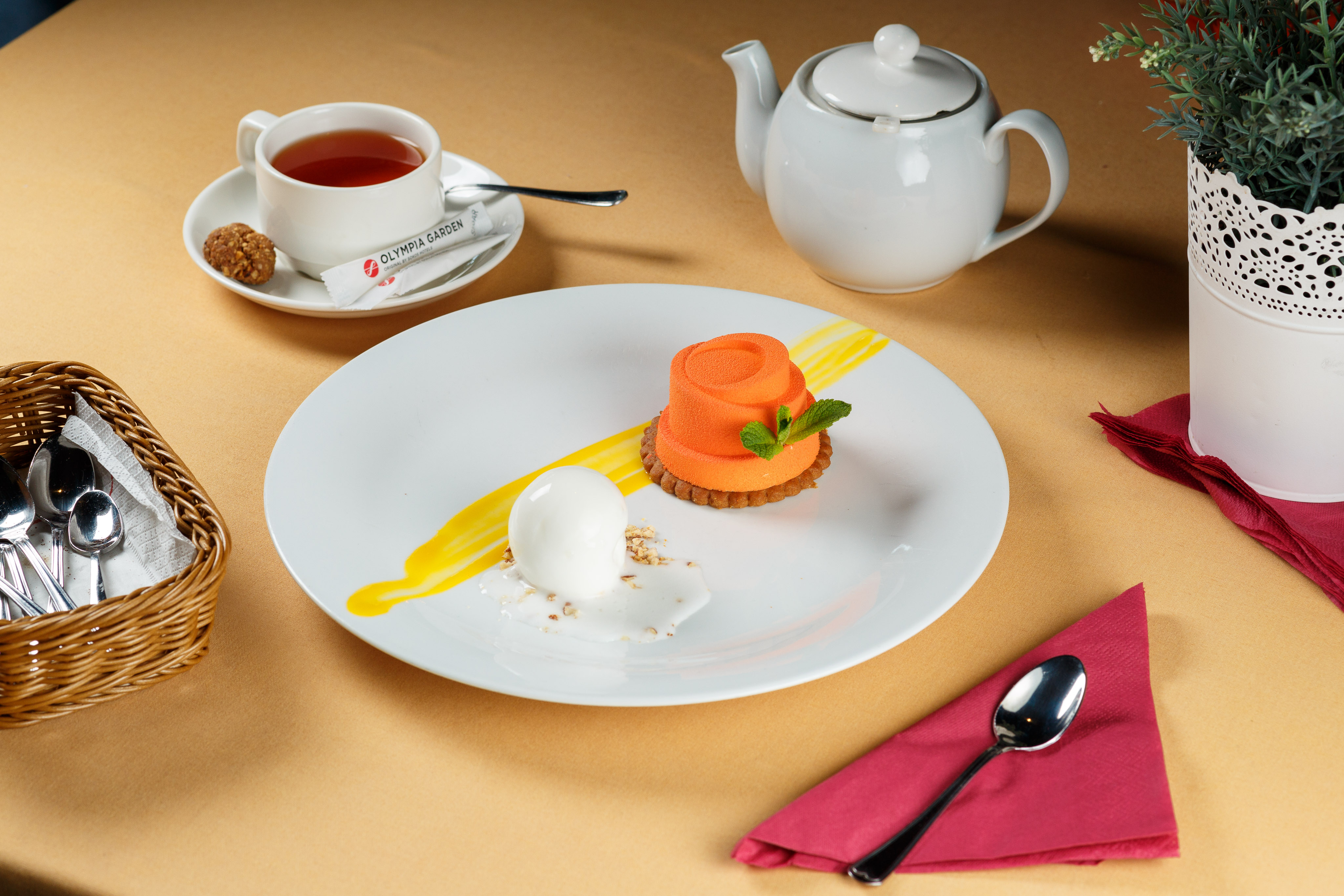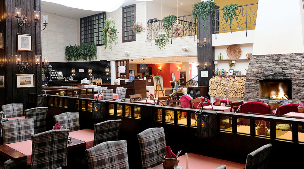 В ресторане помимо диванов и мягких кресел есть настоящий большой камин. Летом работает терраса с видом на сад «Олимпия».