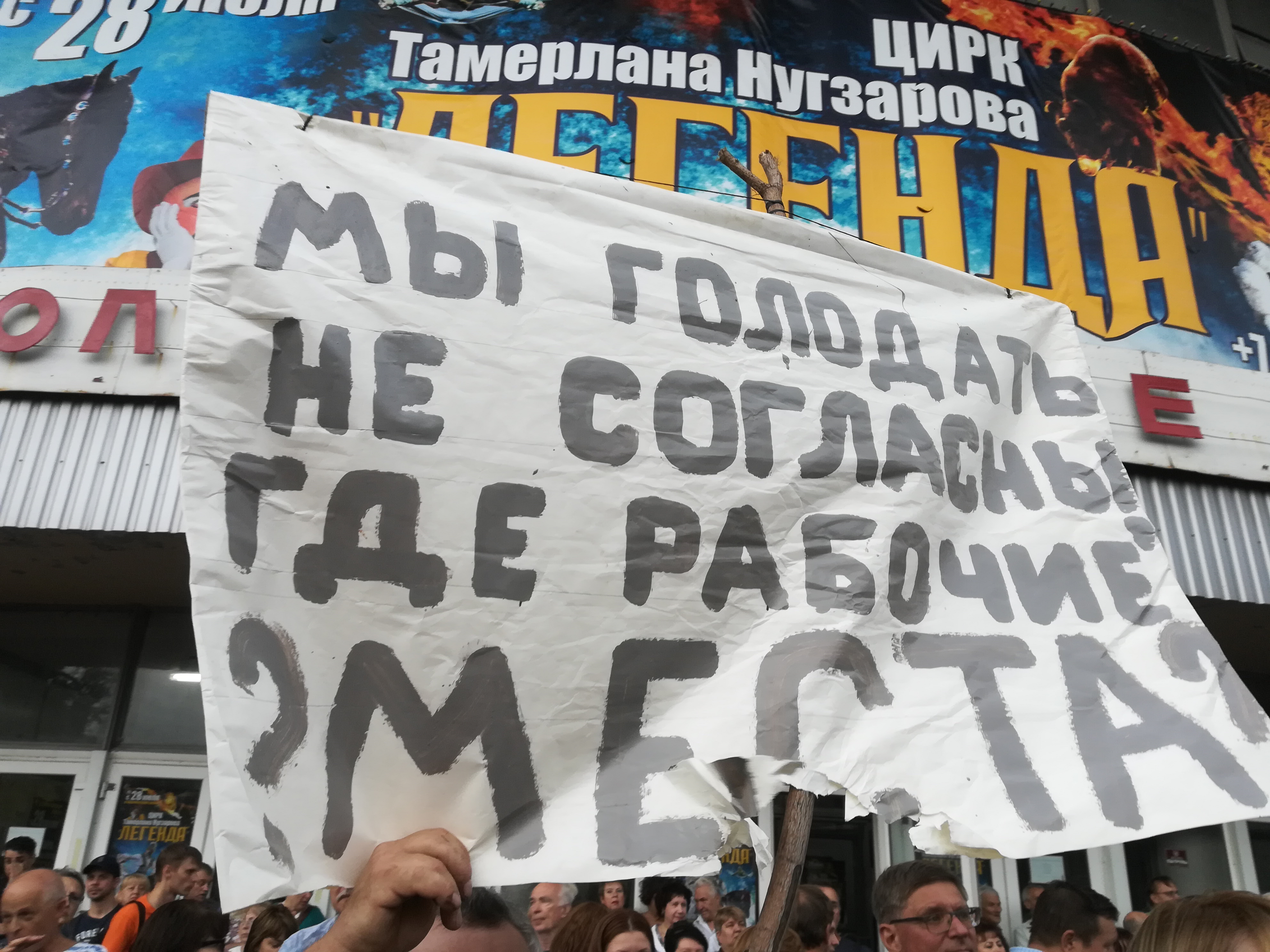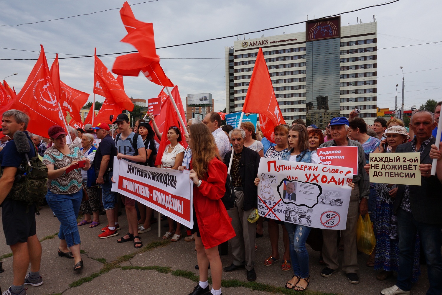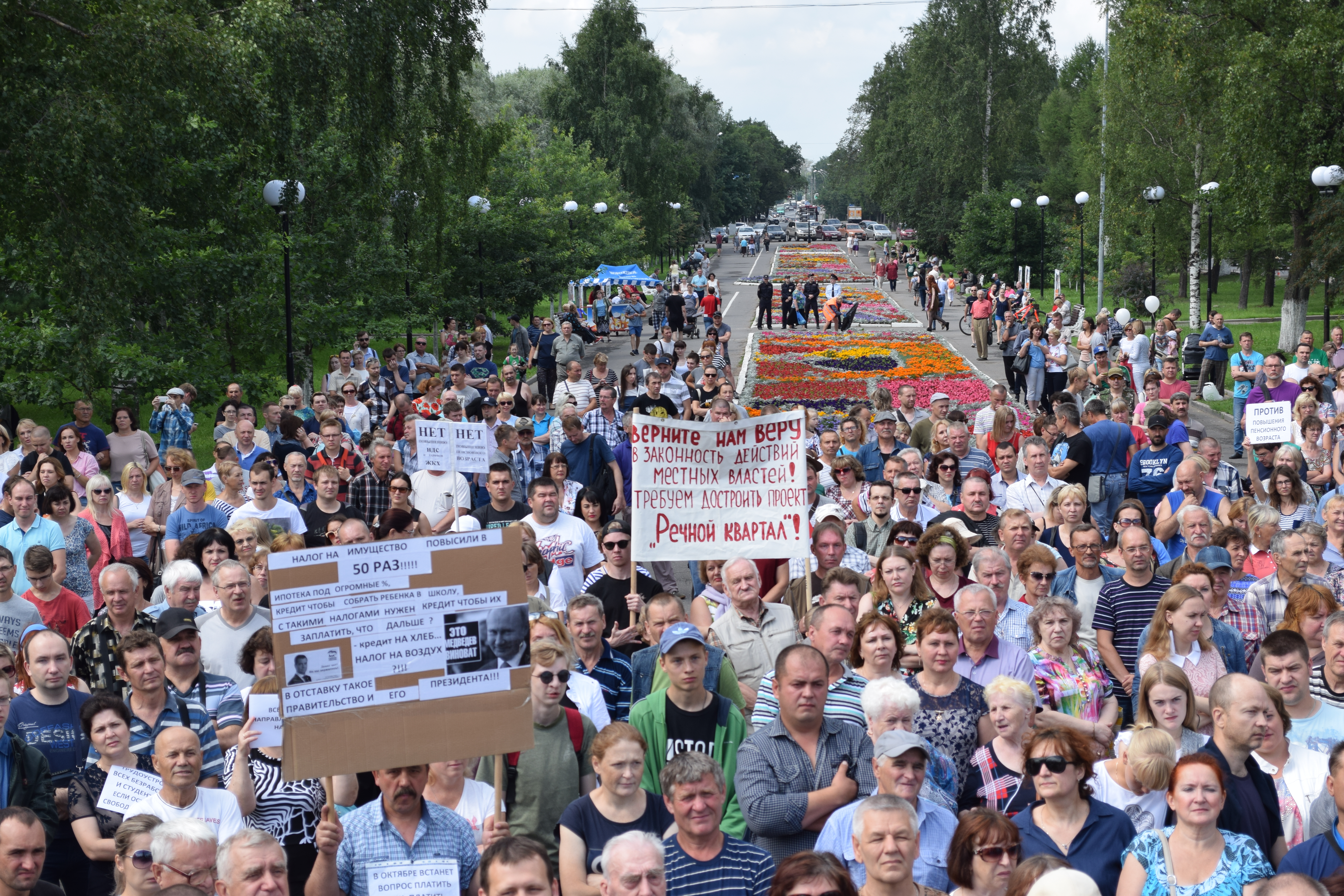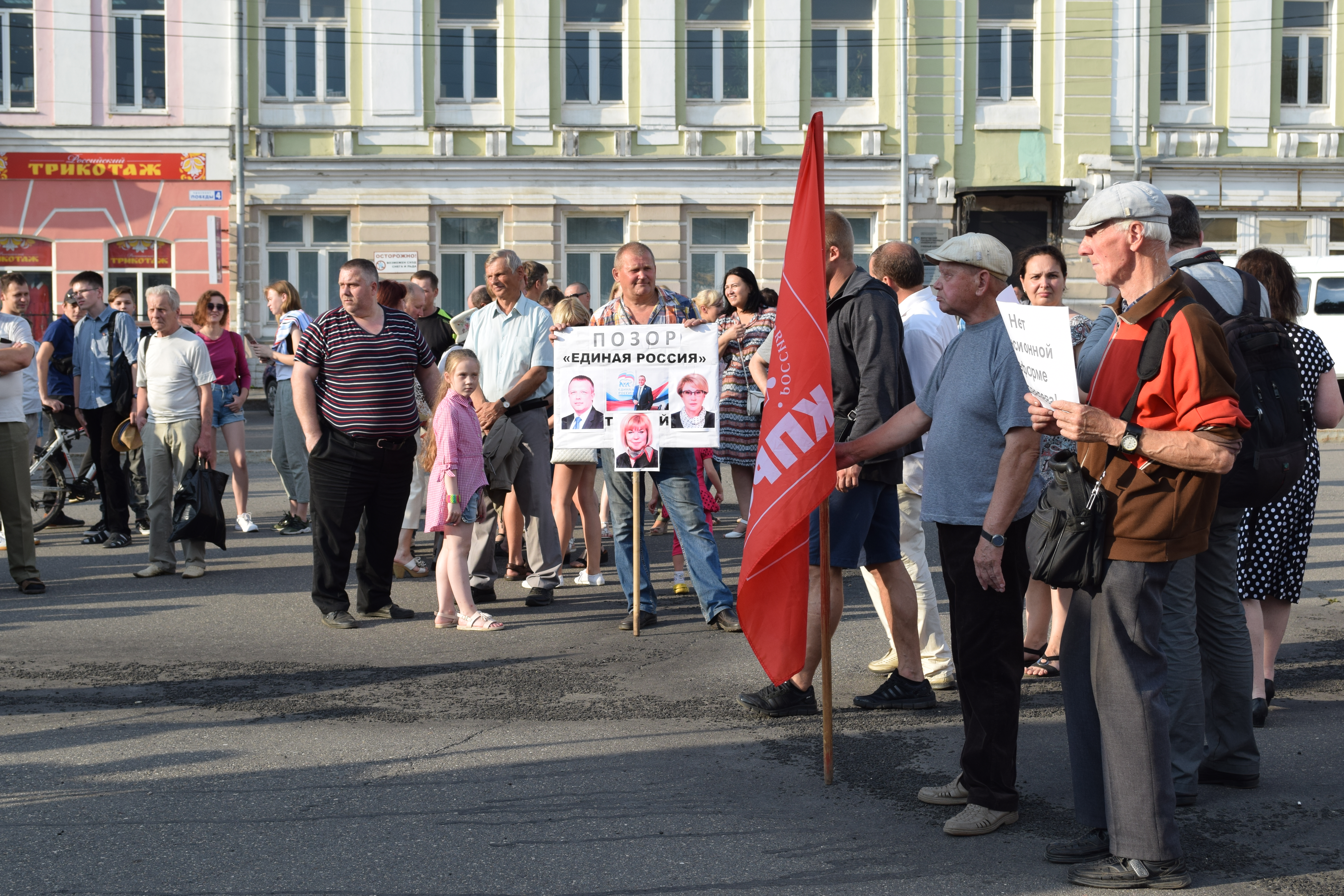 На огороженной ленточками территории митинга выделялись две красные палатки, к ним шли змеевидные длинные очереди. Люди ставили подпись в знак несогласия с решением правительства о повышении пенсионного возраста и проведении всенародного референдума.