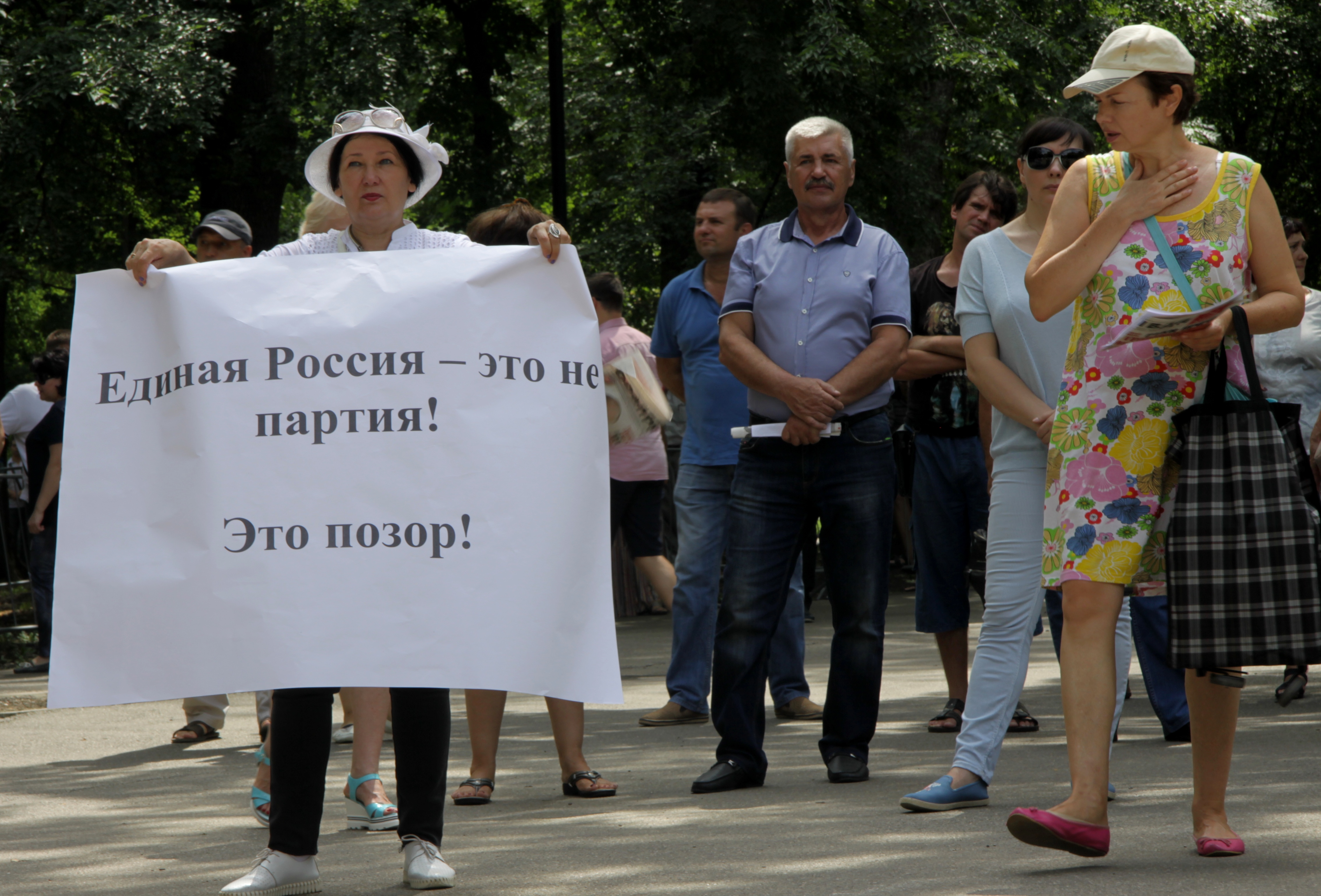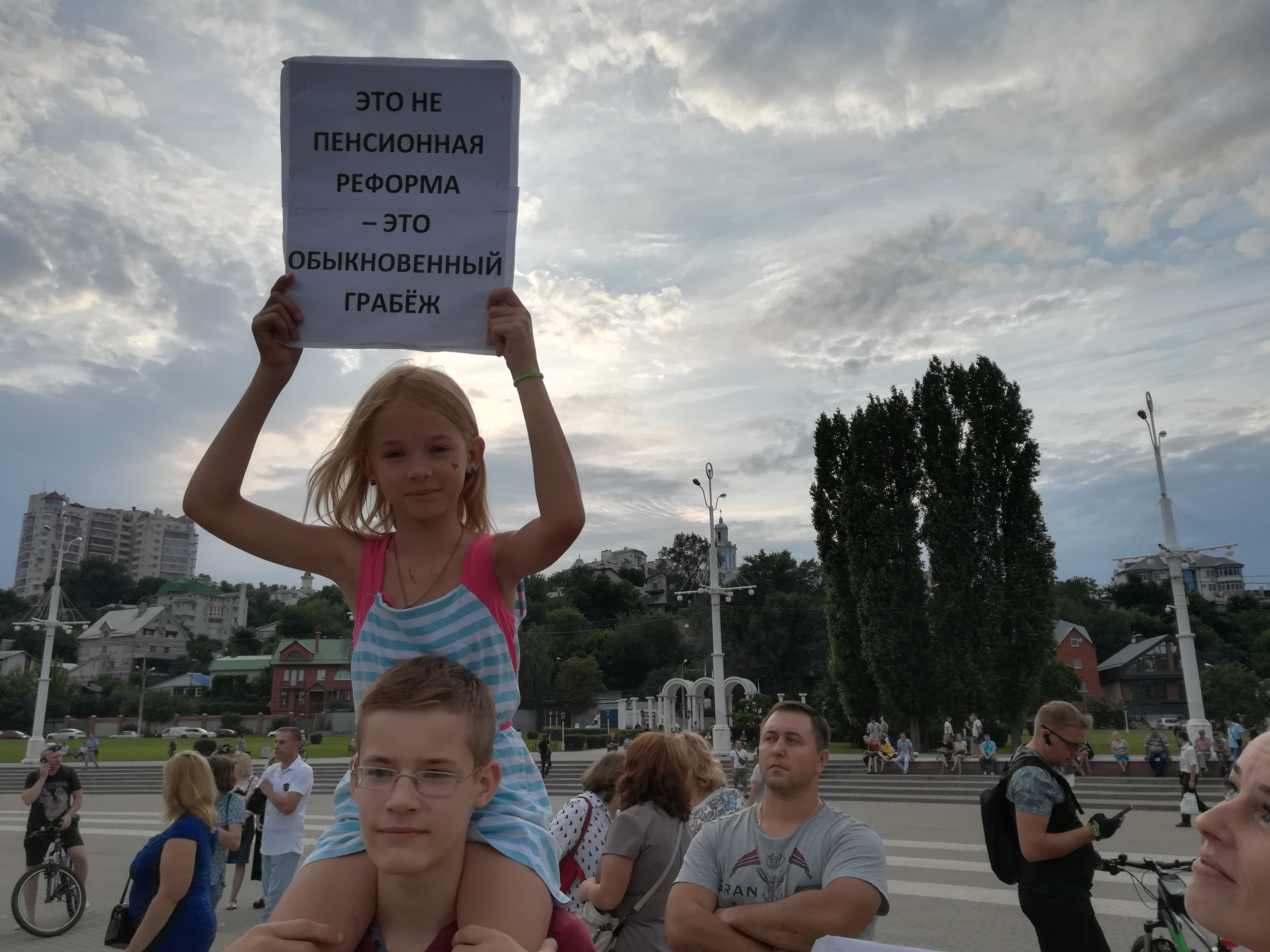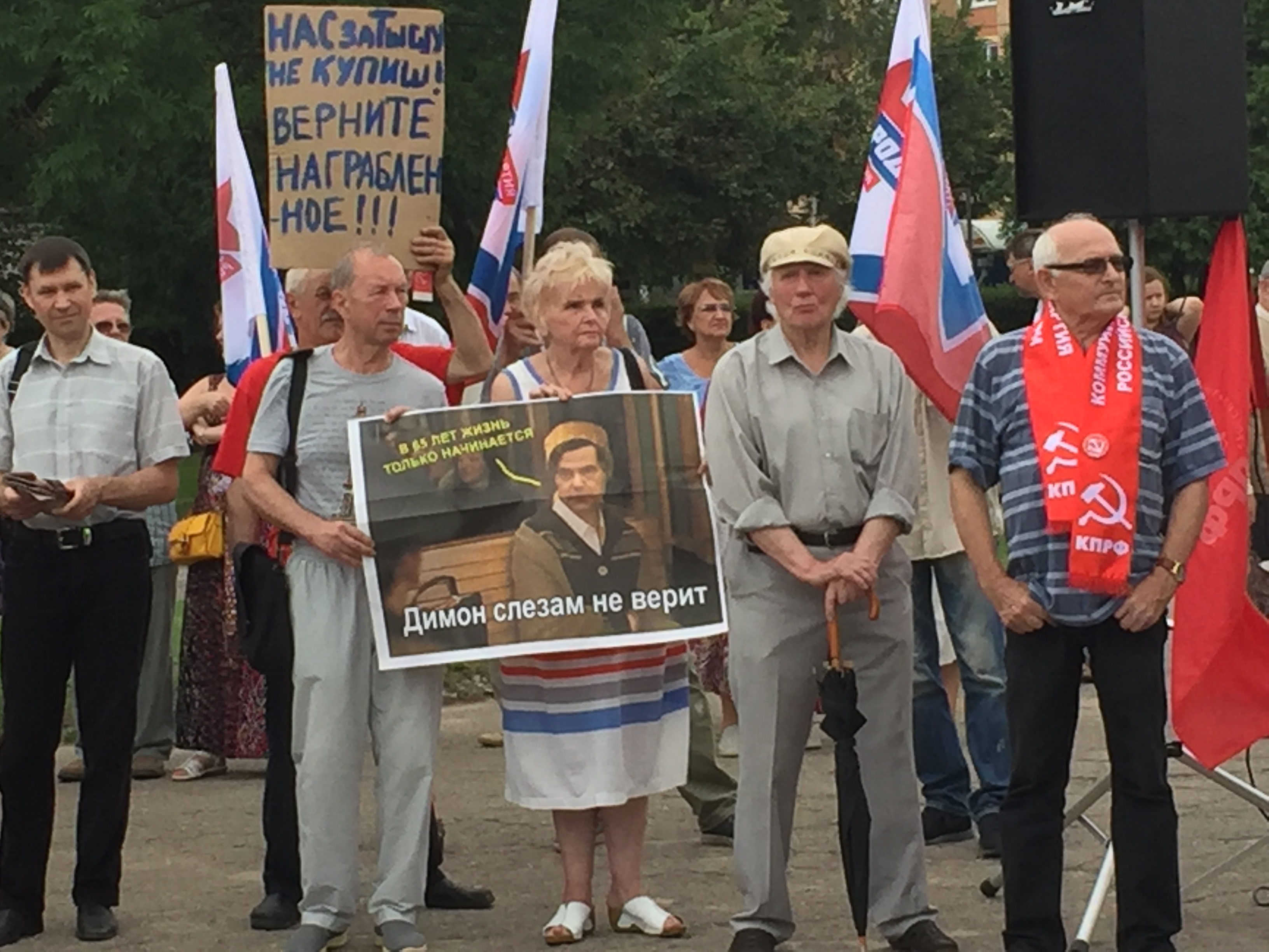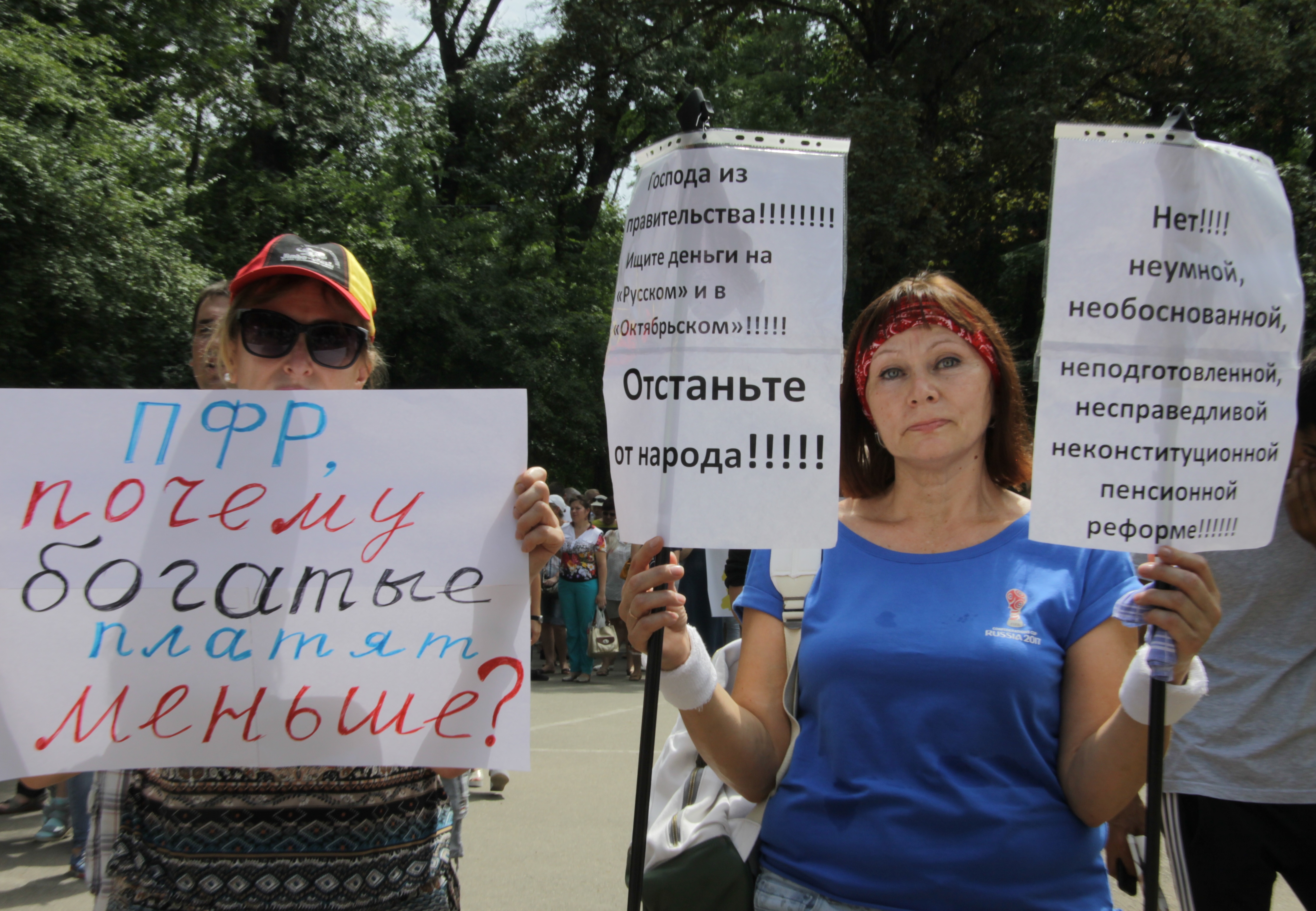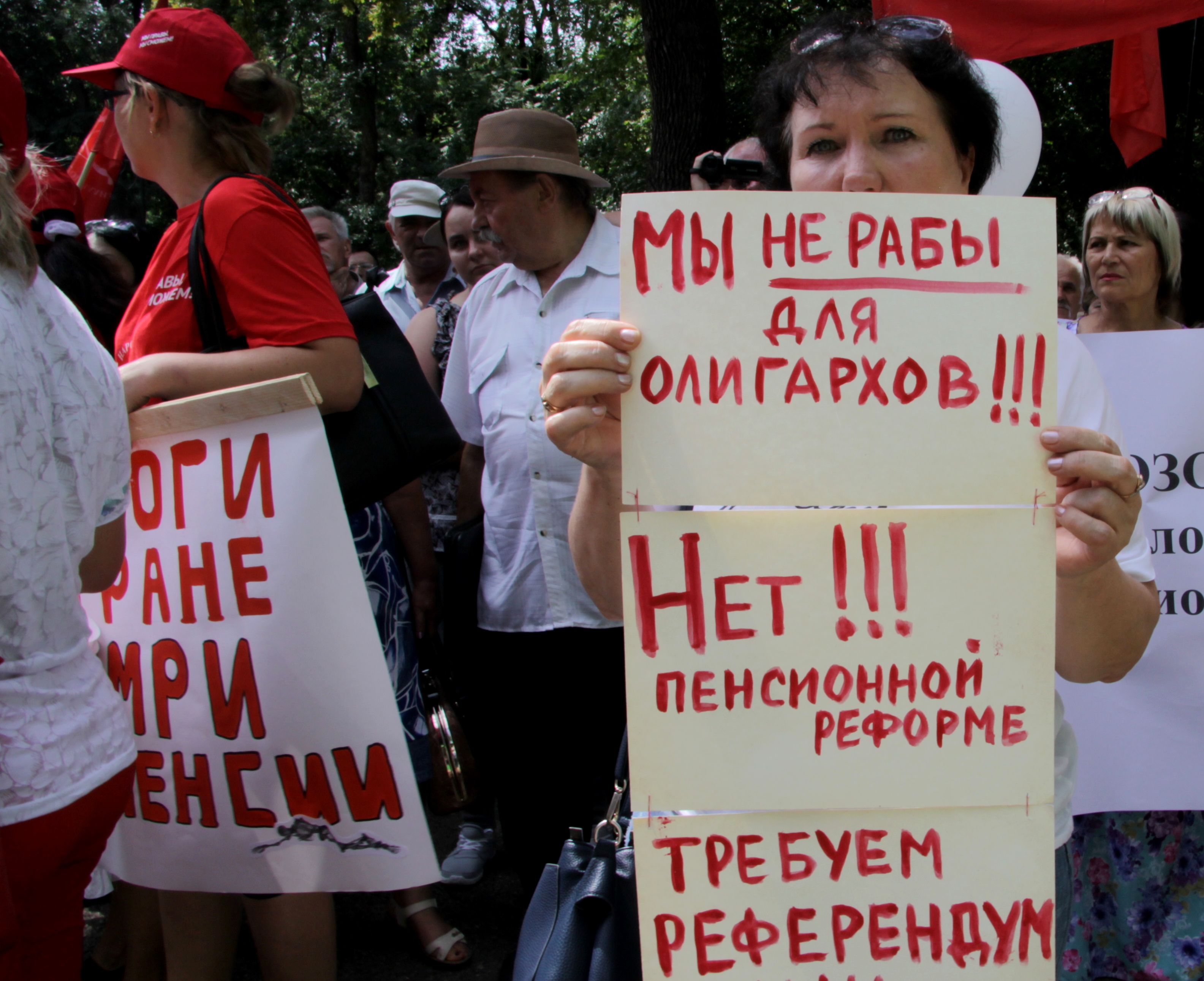 В Краснодаре 28 июля столбик термометра поднялся выше тридцати градусов. На площади в Чистяковской роще, где КПРФ проводит митинг против повышения пенсионного возраста, ни клочка тени. До начала еще час, а люди уже стоят у сцены и у палатки, где собирают подписи против реформы. В одной толпе – пенсионеры, родители с детьми, студенты. На эту акцию пришли не только краснодарцы, здесь и приезжие, которые добирались из других районов края. Многие приехали с плакатами: "В гробу мы увидим эту пенсию", "Пенсии, бензин, НДС, ЖКХ – не для народа, увы, как всегда!", "Сдохнем дружно на работе!", "Растет все, кроме уровня жизни и зарплаты".