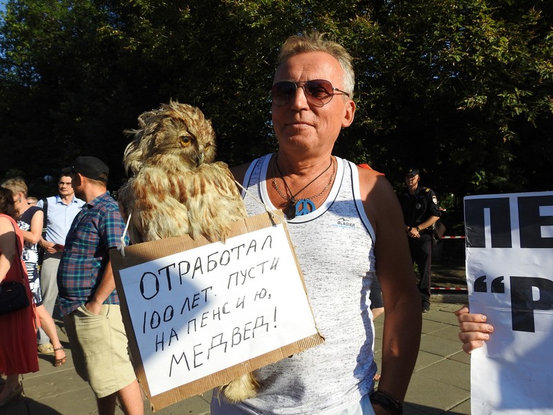 К митингу примкнули участники других оппозиционных движений – со своими плакатами против пенсионной реформы вышли члены НОД, "Открытой России" и сторонники Алексея Навального. Среди участников выделялся мужчина, который принес на акцию чучело совы в качестве иллюстрации того, во что превратится человек, отработав на производстве 100 лет.
