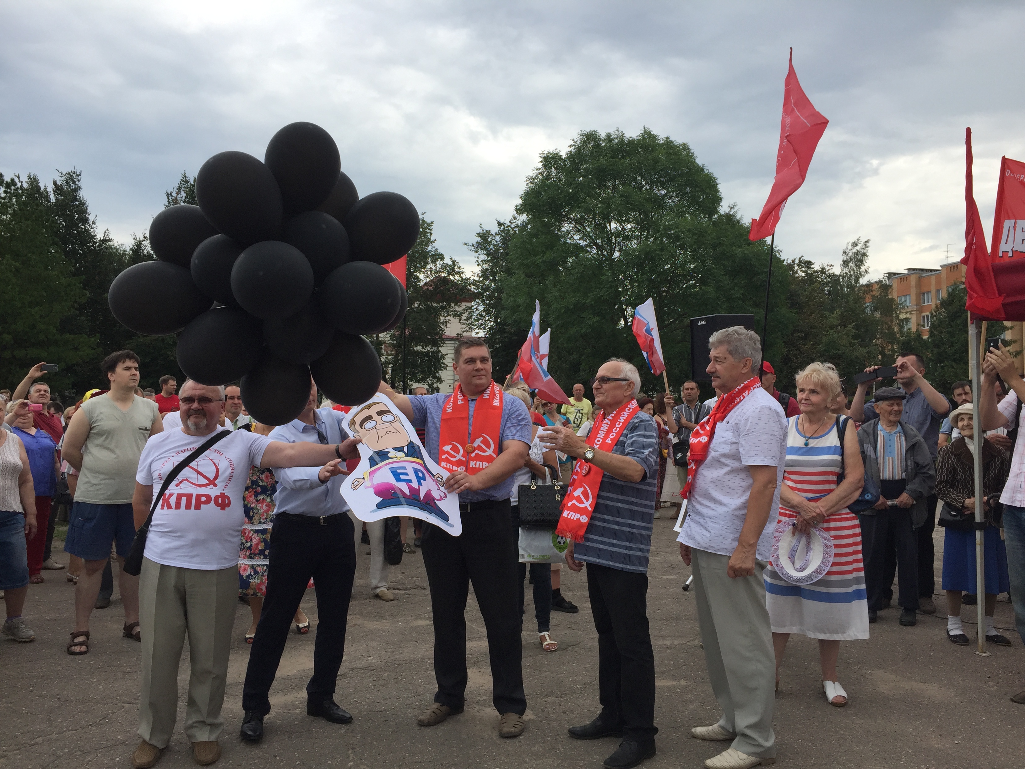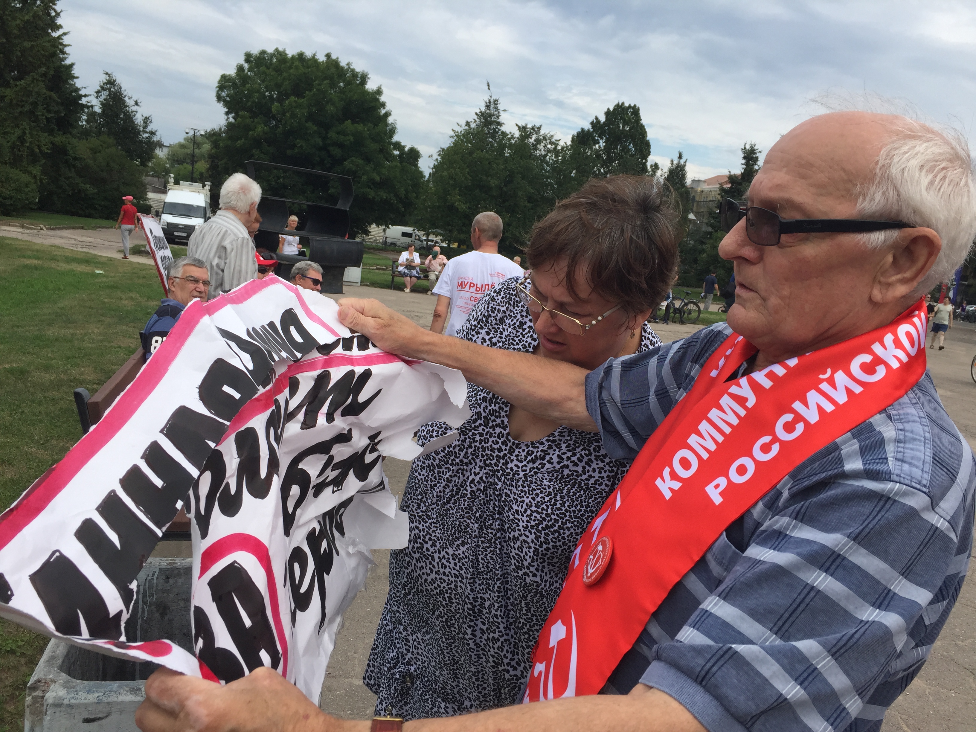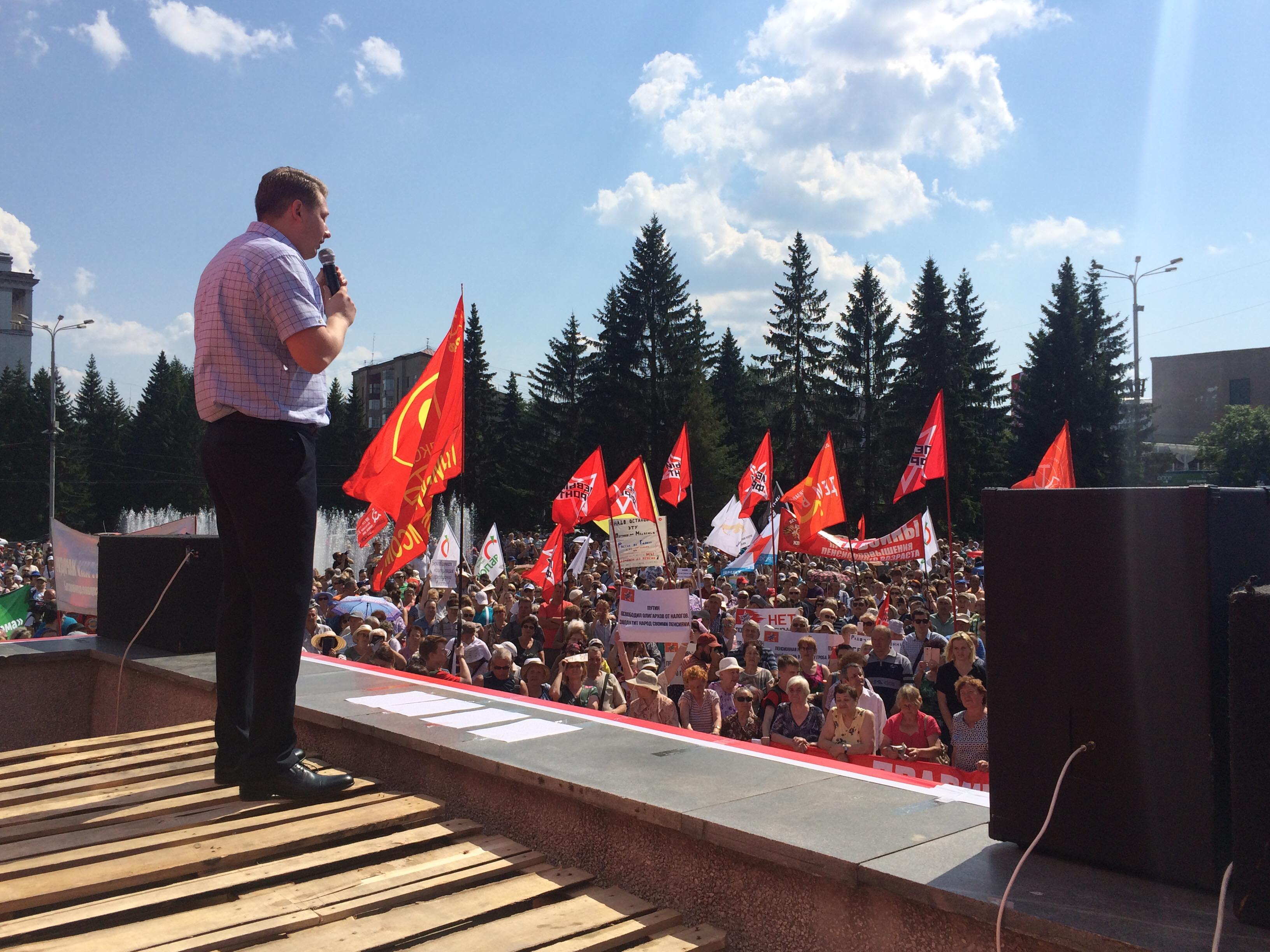 Градус антипутинских настроений на митинге коммунистов поднялся на небывалую для системной оппозиции высоту. Первый секретарь псковского обкома КПРФ, депутат областного собрания Петр Алексеенко, открывая митинг, призвал отправить в отставку правительство и переизбрать Госдуму и президента. Лидер псковского "Яблока", депутат Лев Шлосберг напомнил о миллионных зарплатах министров: "Так им на зарплаты не хватает! Они повышают пенсионный возраст не для того, чтобы отдать деньги бедным, а чтобы оставить себе". Представитель "народно-патриотических сил" Сергей Костец призвал заклеймить "Единую Россию", проголосовавшую за реформу, званием "антинародной преступной группировки".