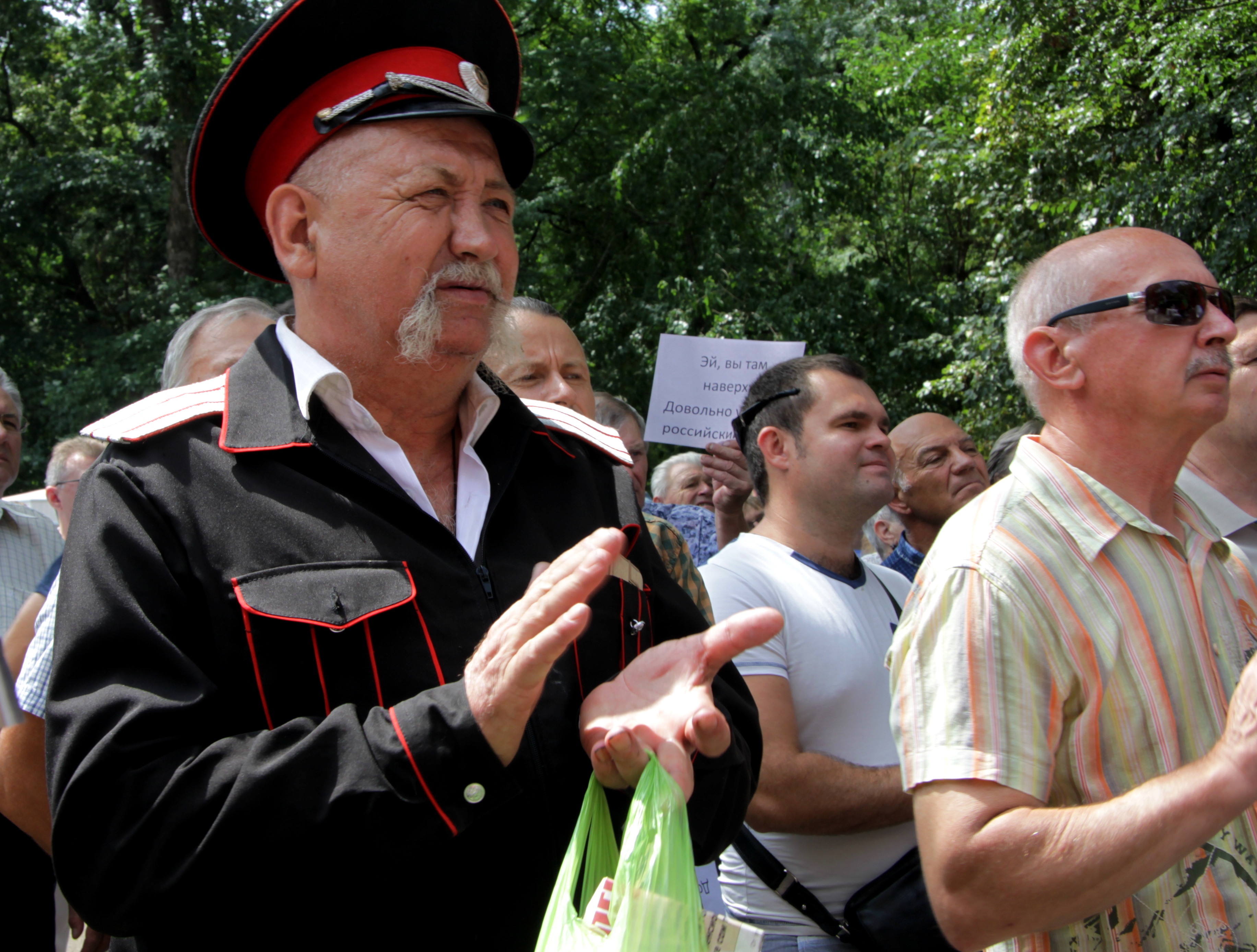 – Я журналист, правозащитник, атаман. Я все время с теми, кто сражается за правду. Я был и у коммунистов, и у Навального на митингах был. Меня задерживали много раз. Мне 65 лет, мне пенсию так и не дали, хотя закон еще не действует. В стране цены растут буквально на все, образования нет, здравоохранения нет, ничего у нас нет, по сути. И почему мы должны молчать? – задается вопросом мужчина в казачьей форме.