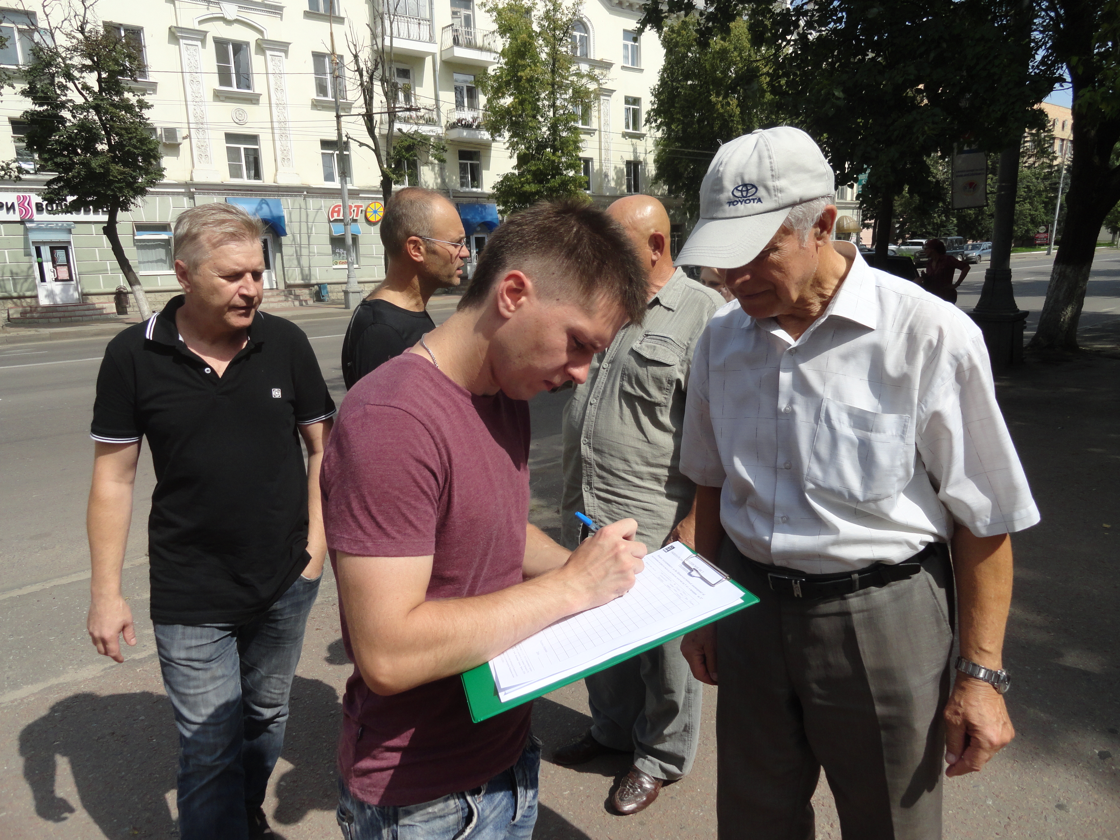 – Вот вы собираете подписи, а потом кому отправите, министрам, которые всё это продвигают? Какой от этого практический толк? – вопрошает невысокого роста мужчина у человека с флагом.