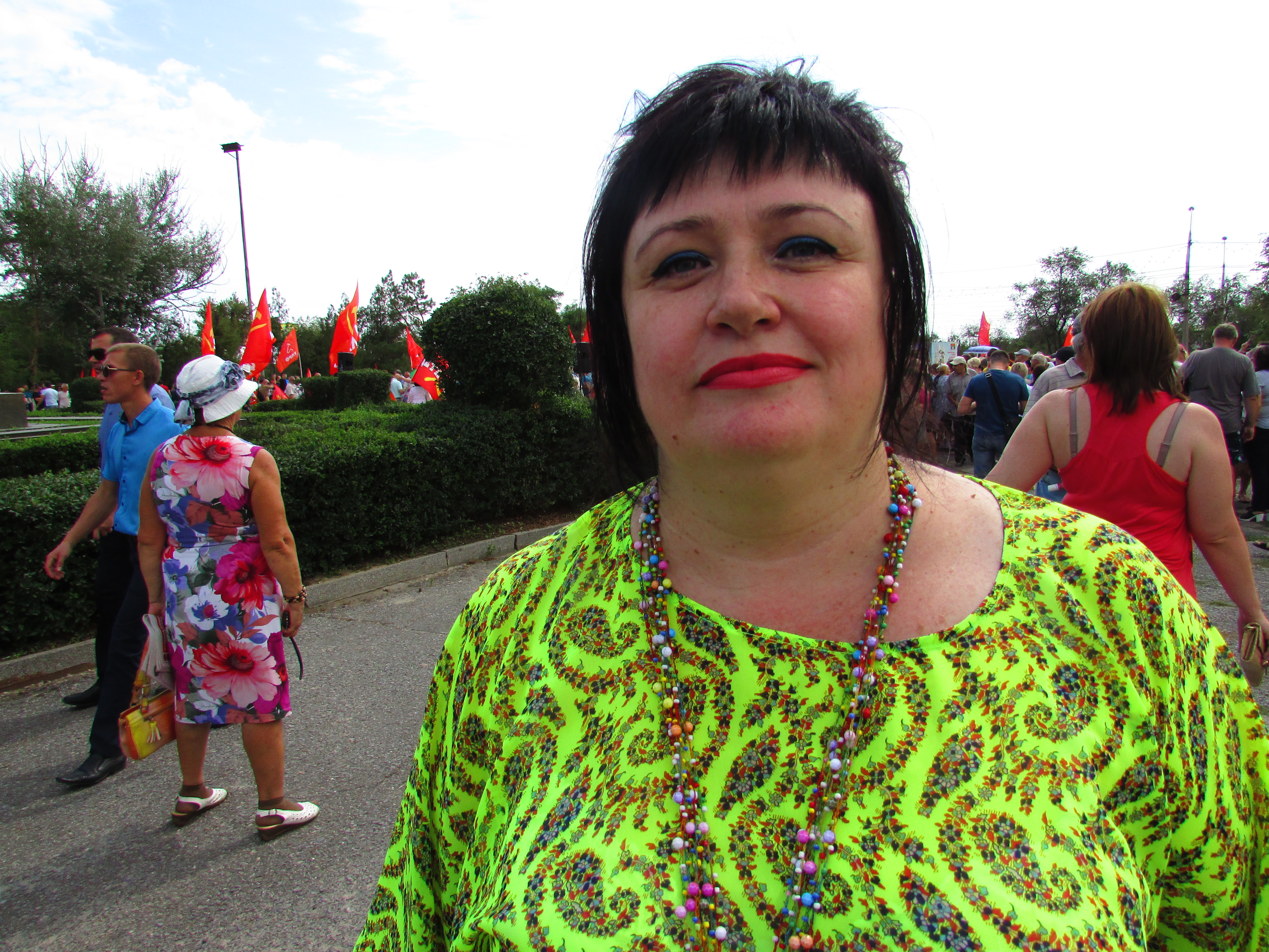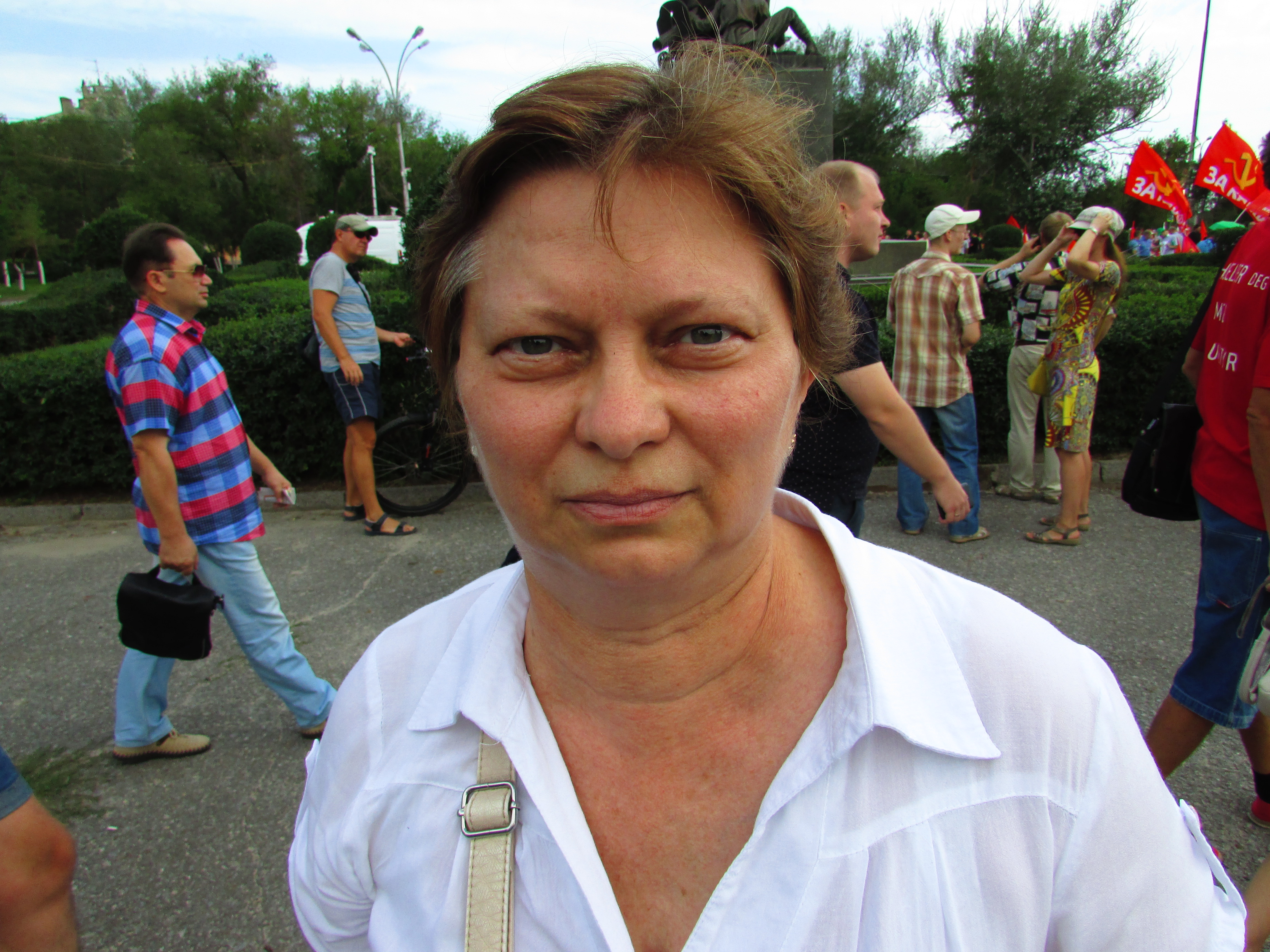 Женщина с красным флагом с символикой КПРФ добавляет: "Этот великий Путин – сволочь! Пенсионеры ходят на рынок, чтобы понюхать рыбку, которую рекламируют по телевизору. Кто ее может купить, скажите? Я не могу себе рыбы позволить покушать вдоволь на свою пенсию!"