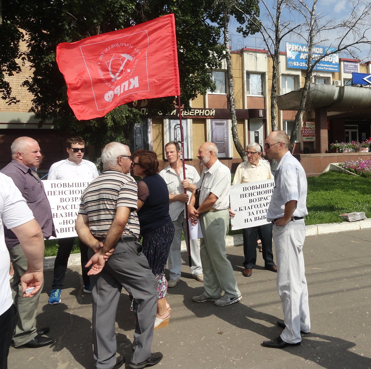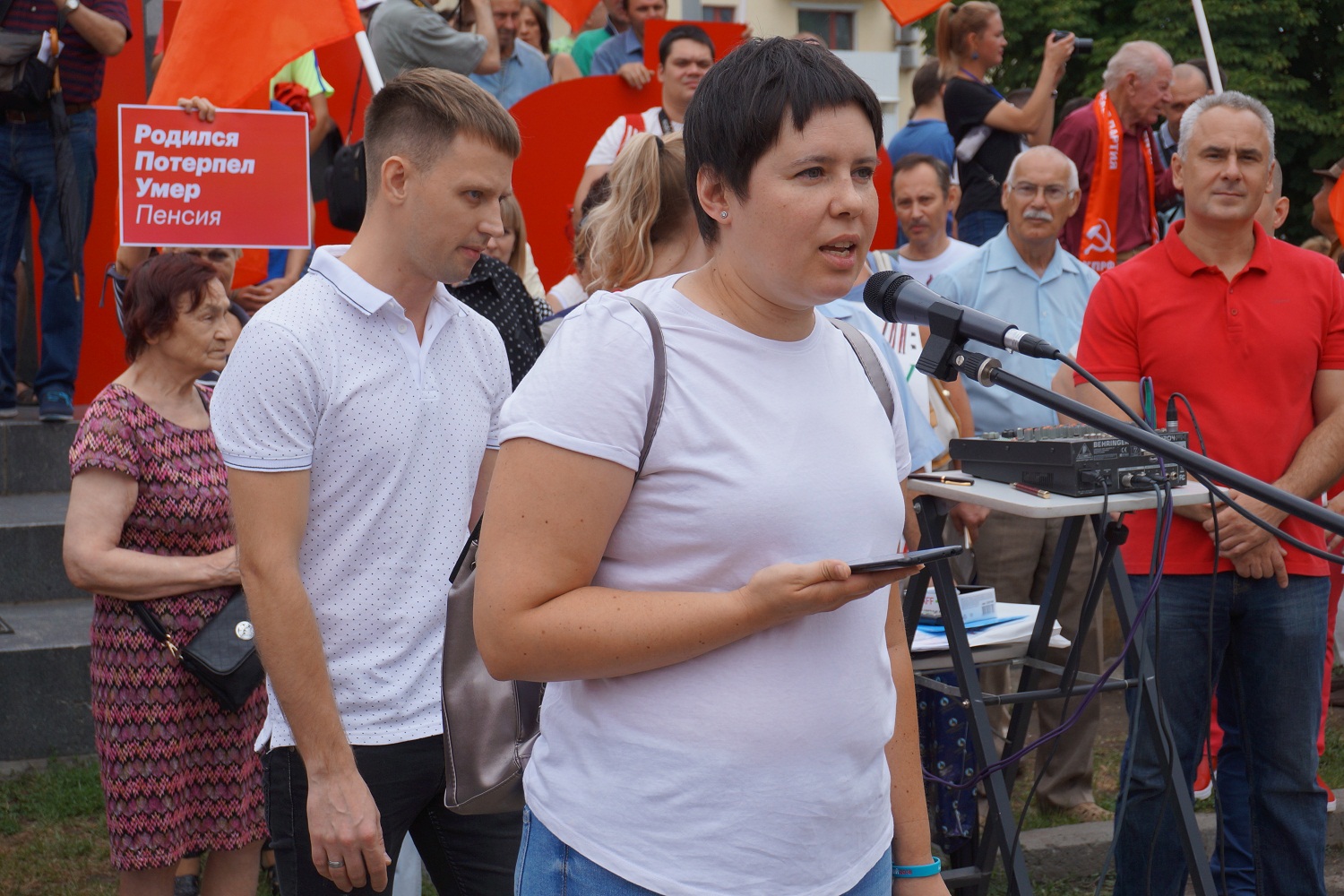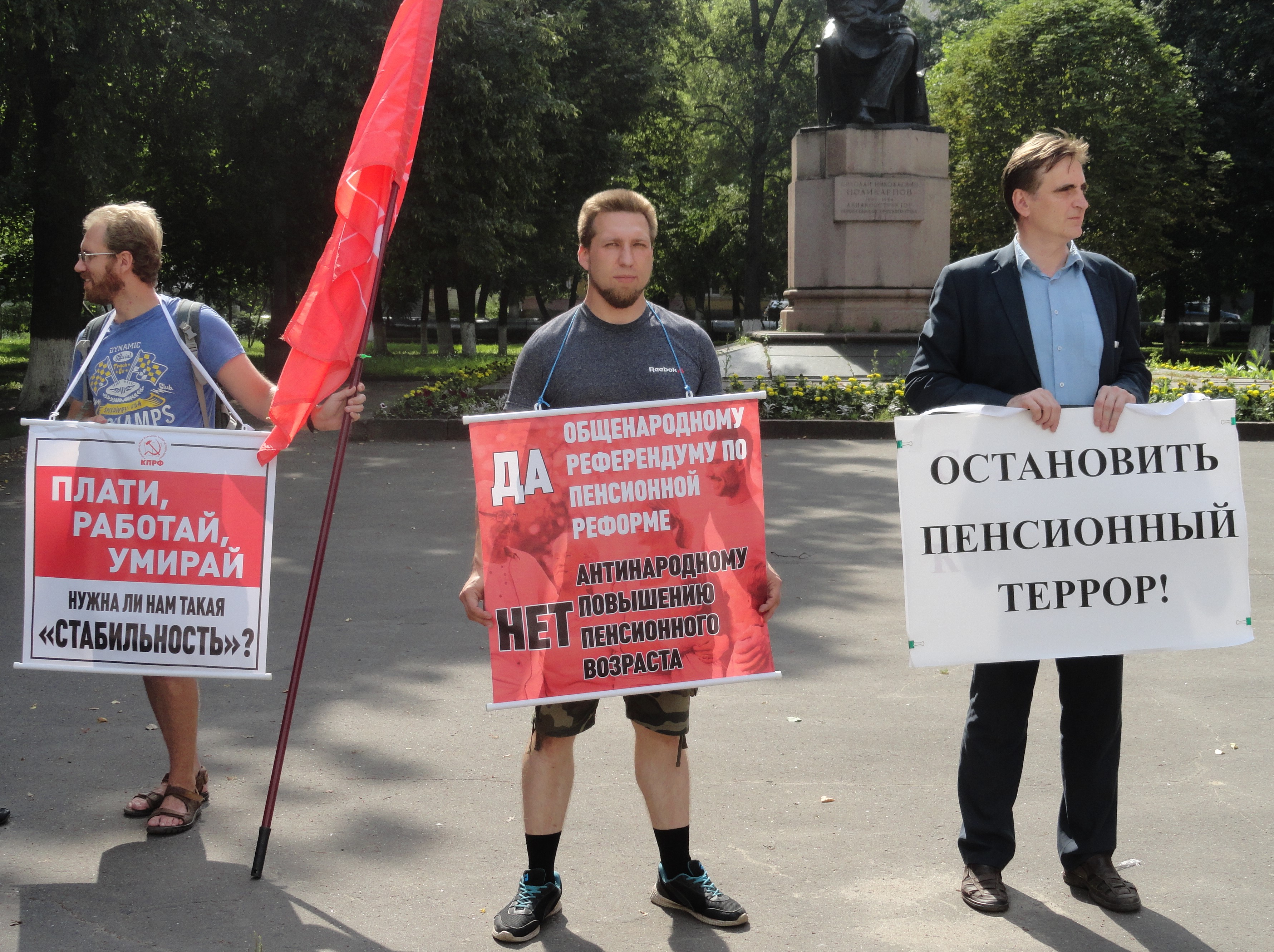 На площадке перед проходной бывшего машиностроительного завода имени орловского революционера Михаила Медведева собрались несколько десятков человек. В руках у них флаги КПРФ и плакаты с протестными лозунгами. Горожане не из числа партийных, преимущественно предпенсионного возраста, беседуют с коммунистами о судьбе “антинародной” реформы. На улице жарко, воздух в городе прогрелся до +31 градуса.
