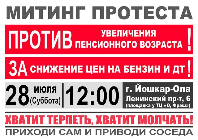 Я не силен в хитросплетениях политической жизни республики, но я уверен в одном — нужно объединяться в борьбе с произволом, который, как я считаю, власти держащие совершают с народом. Главная задача всех партий — это улучшение жизни народа. На этом и нужно строить фундамент сотрудничества. В этом и есть весь смысл деятельности всех оппозиционных партий. Было очень много сказано относительно того, к чему приведет повышение пенсионного возраста, и в этом повышении ни государству, ни народу ничего хорошего не светит. На митинге также объявили тех депутатов Госсобрания республики Марий Эл, кто поддержал пенсионную реформу. Перечислять этих граждан я не буду, так как для меня они не «существуют», а хочу лишь написать фамилии тех, кто не поддержали этот «нечеловеческий» и аморальный законопроект.