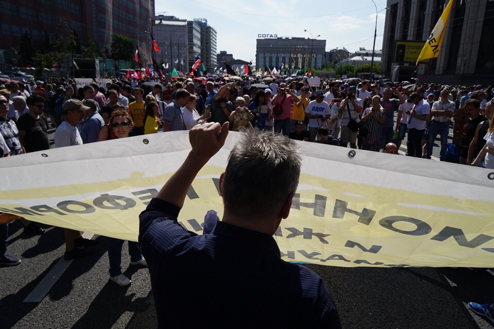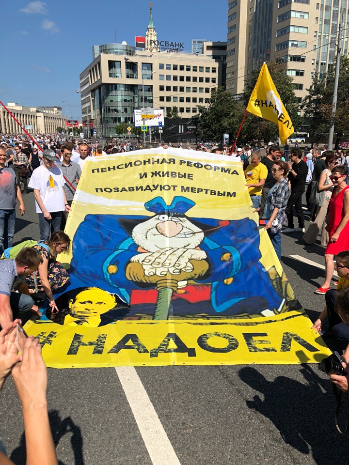 Сходили с друзьями на митинг против пенсионной реформы. Лето, солнце, отличная погода для таких мероприятий, хотя и явно влияет на численность: многие предпочитают пляжи и отдых за городом.