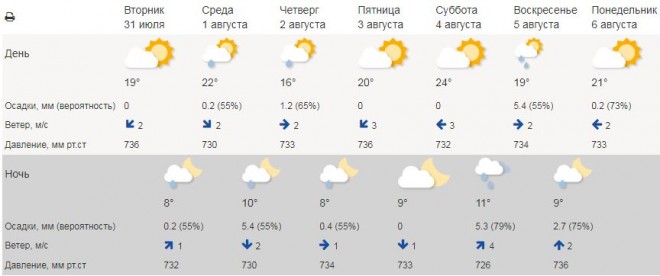 В воскресенье, 5 августа, днем +19°С, ночью +11°С.