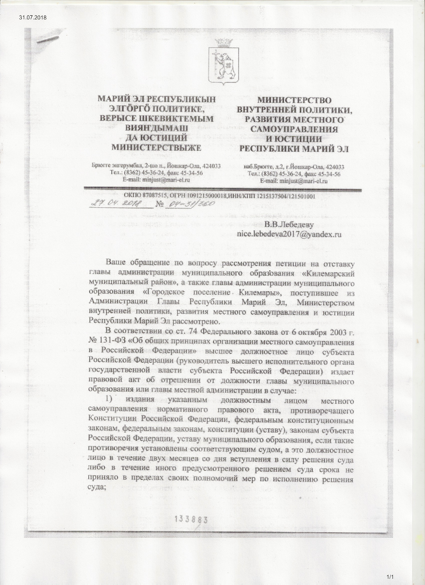 Президенту России Путину В.В. , а так же Врио главы Марий Эл Евстифееву А.А.: просим вас отправить в отставку главу Килемарского р-на Толмачеву Л.А. (https://www.change.org/p/просим-вас-отправить-в-отставку-главу-килемарского-района) . Просим расследовать все указанные претензии в петиции.