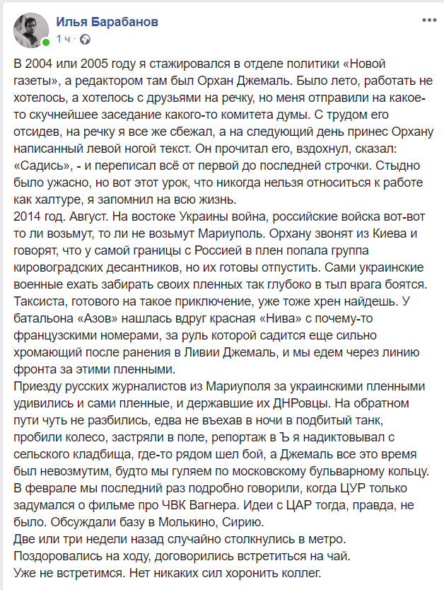 • Орхан Джемаль — один из самых известных российских военных репортеров. В начале 2000-х он возглавлял отдел политики «Новой газеты», затем был обозревателем русского Newsweek и «Известий». Джемаль писал репортажи с войны в Грузии (о ней он написал книгу), Ливии, Сирии, на востоке Украины. В последнее время единственным изданием, где регулярно выступал Джемаль, было «Эхо Москвы», — вот записи и расшифровки его последних эфиров.