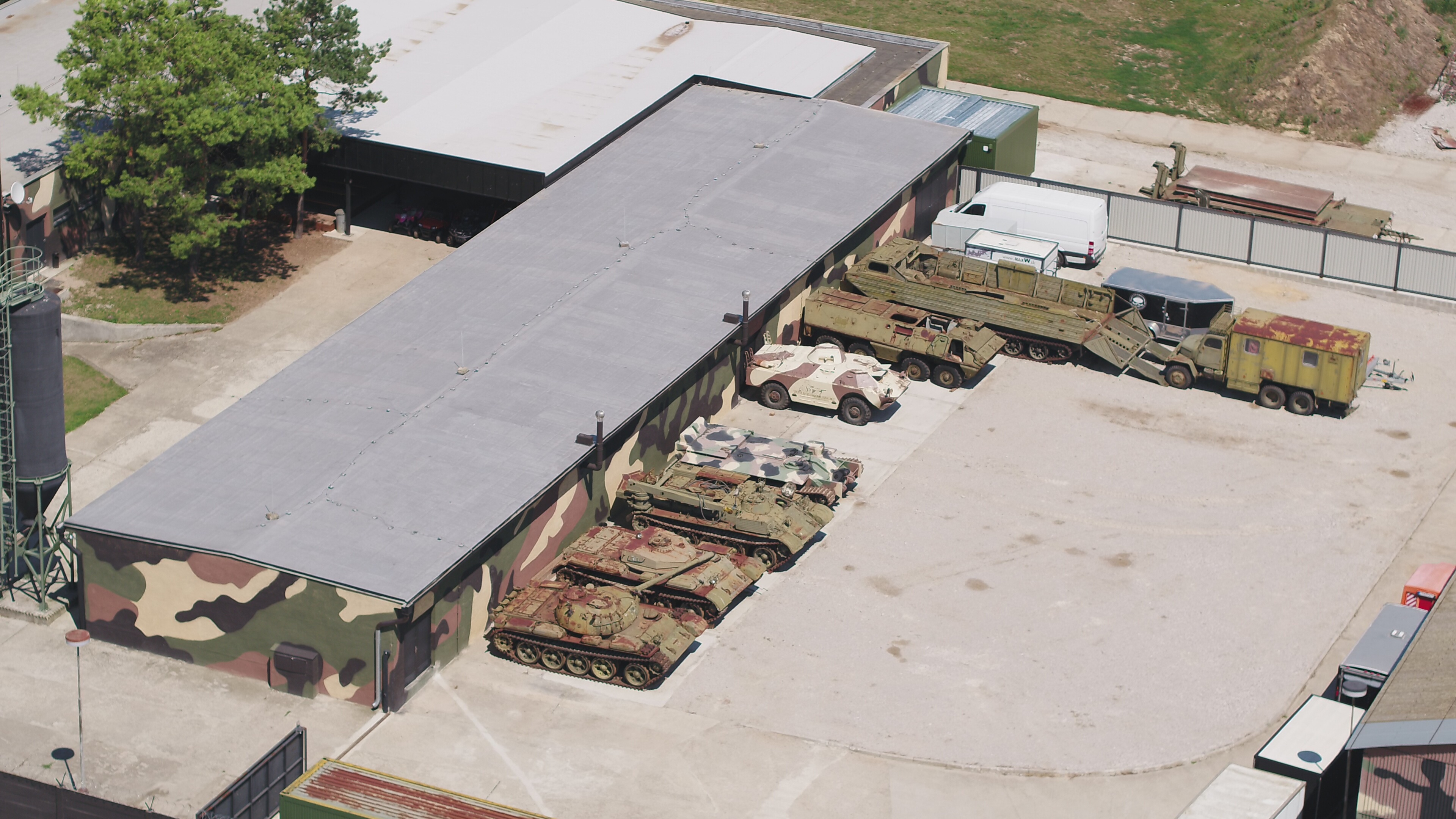 Радио Свобода удалось снять базу с помощью беспилотного устройства. На кадрах можно разглядеть большое количество старой военной техники – танков и бронемашин. При этом журналисты столкнулись с угрозами со стороны представителей организации.