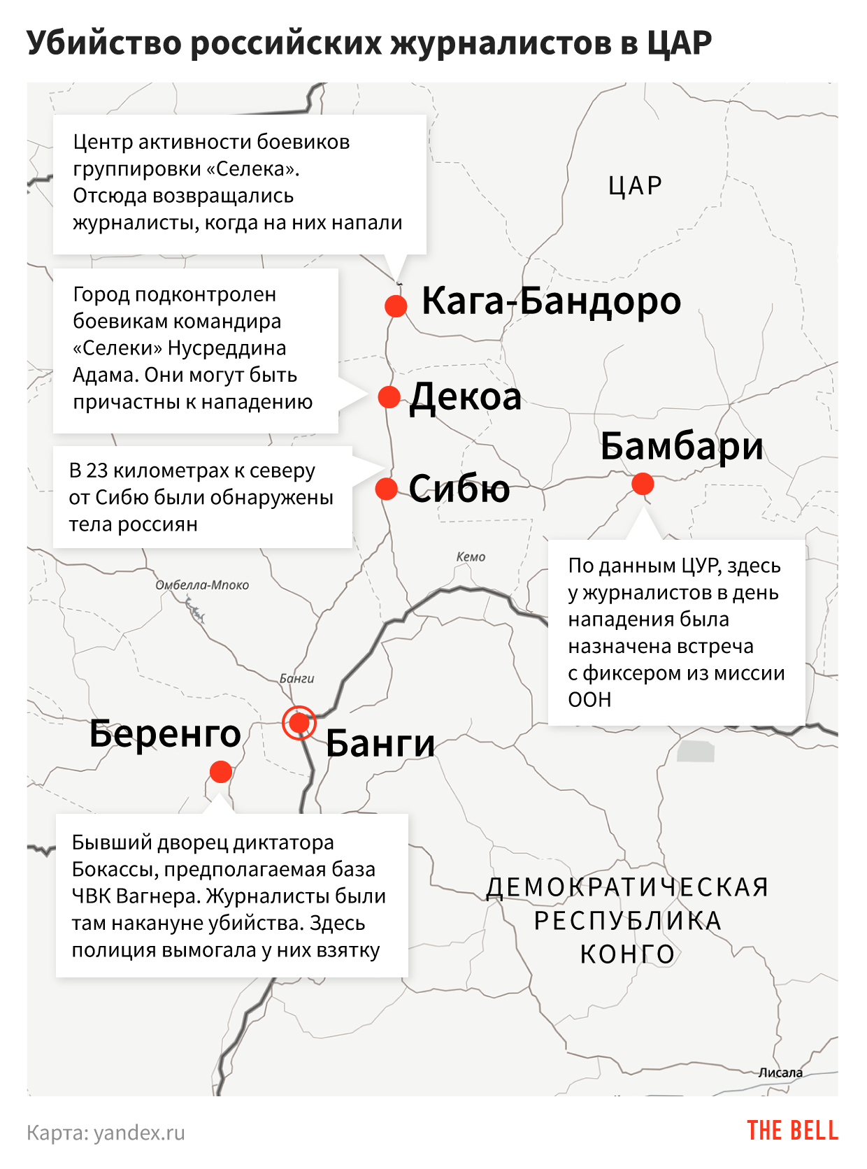 • В день убийства Орхан Джемаль, Александр Расторгуев и Кирилл Радченко должны были направиться в город Бамбари к востоку от столицы ЦАР Банги. Там у них была назначена встреча с фиксером — сотрудником ООН, который должен был в том числе помочь им со съемками золотых приисков Ндассима, сообщил сегодня вечером «Центр управления расследованиями» Михаила Ходорковского, организовавший поездку.