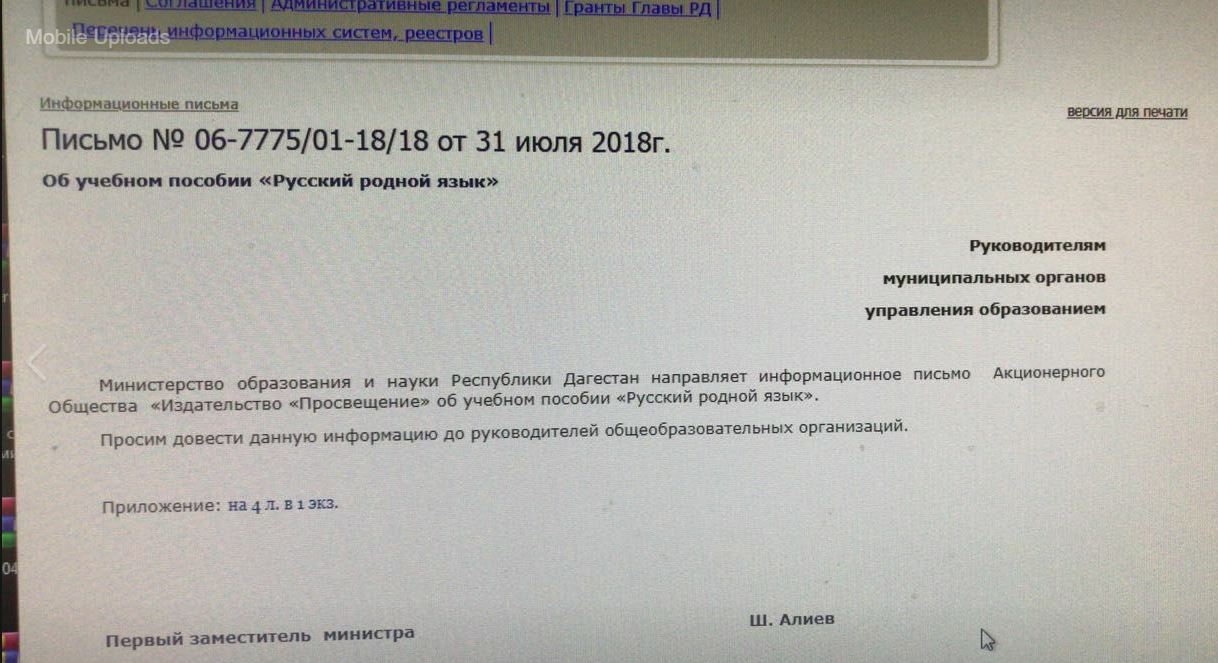 Министерство образования и науки Республики Дагестан направило информационное письмо издательства "Просвещение" руководителям муниципальных органов управления образованием об учебнике "Русский родной язык".